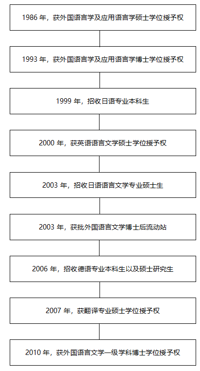 学院1986年获外国语言学及应用语言学硕士学位授予权,1993年获外国语言学及应用语言学博士学位授予权,2000年获英语语言文学硕士学位授予权,2003年设立外国语言文学博士后流动站,2007年获翻译硕士专业学位授予权,2010年获外国语言文学一级学科博士学位授予权。学院始终坚持 “人才强院、国际化、学科交叉、产学研结合、对接国家战略”五大战略,锐意进取,不断创新,在教育部第五轮学科评估中成绩优异,外国语言文学学科位居全国前3%。