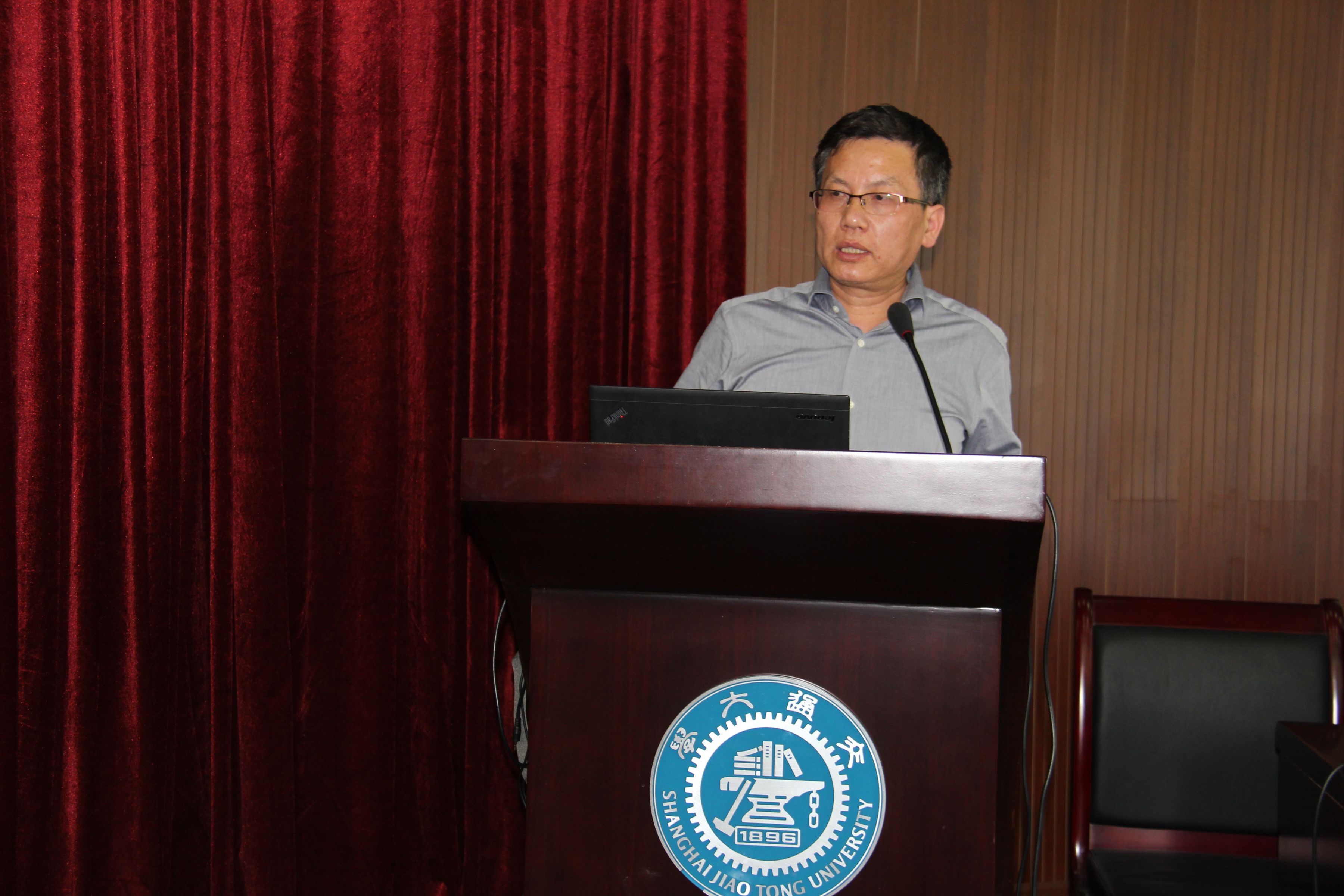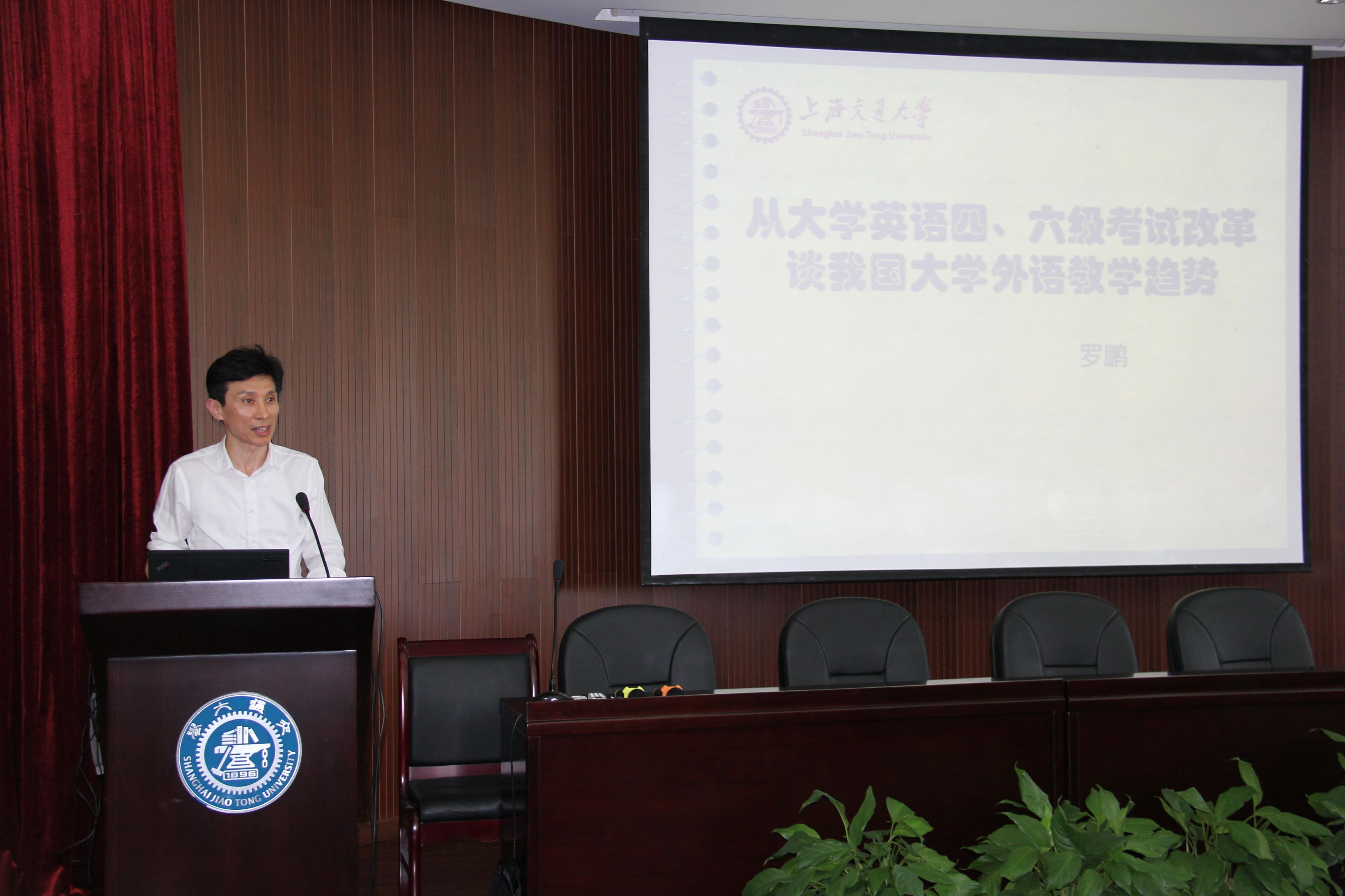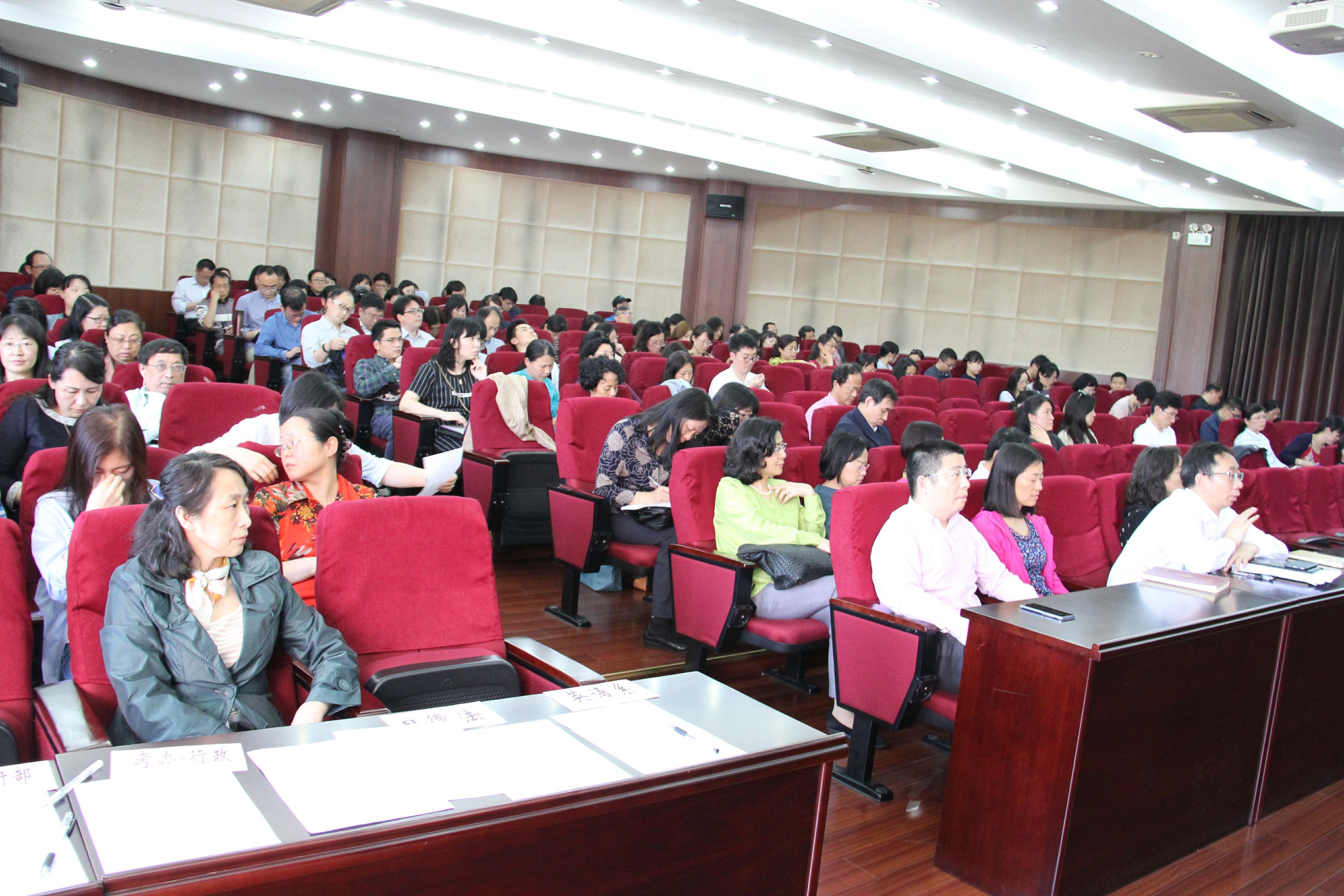 该会议主要有两个议题。首先由胡开宝院长作外院近期工作报告,围绕“立德树人,教书育人”的推进工作和外院教学改革展开。然后全国大学英语四、六级考试委员会罗鹏教授作了主题发言——“从大学英语四、六级考试改革谈我国大学外语教学趋势”。