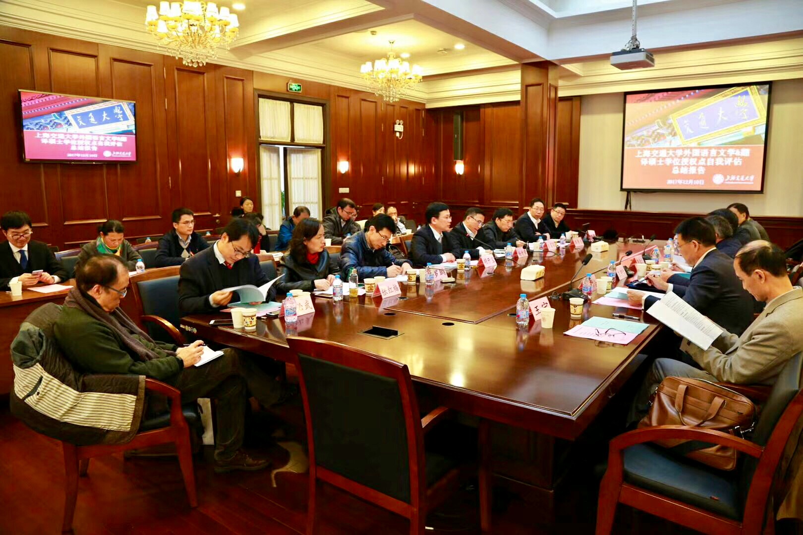 12月10日,新葡萄8883官网AMG官网外国语言文学学科学位授权点合格评估专家评审会在徐汇校区总办公厅举行。评审会针对外国语言文学一级学科博士点及翻译硕士专业学位硕士点进行了评估。国务院学科评议组成员、中国社会科学院外国文学研究所所长陈众议教授,国务院学科评议组成员、北京外国语大学王克非教授,南京大学王守仁教授,清华大学“长江学者”特聘教授王宁,四川大学石坚教授,全国翻译硕士专业学位教指委副主任委员仲伟合教授,华中师范大学罗良功教授,7位教授担任评审专家。新葡萄8883官网AMG官网研究生院副院长杨升荣、研究生院学科建设办主任张国栋、新葡萄8883官网AMG官网党委书记罗鹏、院长胡开宝、副院长彭青龙、党委副书记张红梅、副院长陶庆、院长助理尚必武出席会议。另有13名教师代表、10名学生代表参会。7位专家在听取汇报、查阅资料和座谈交流的基础上,一致认定此次评审结果为合格。