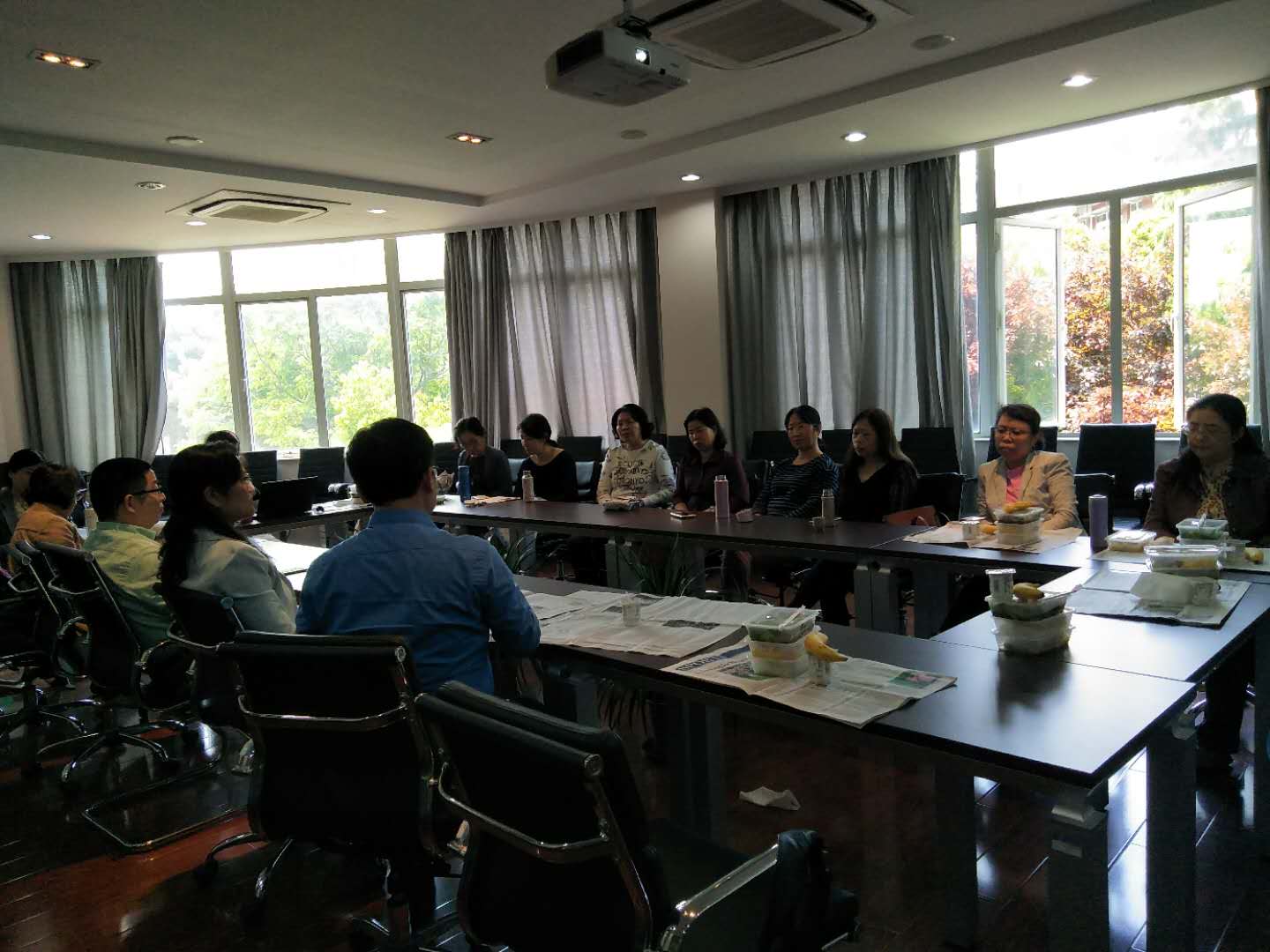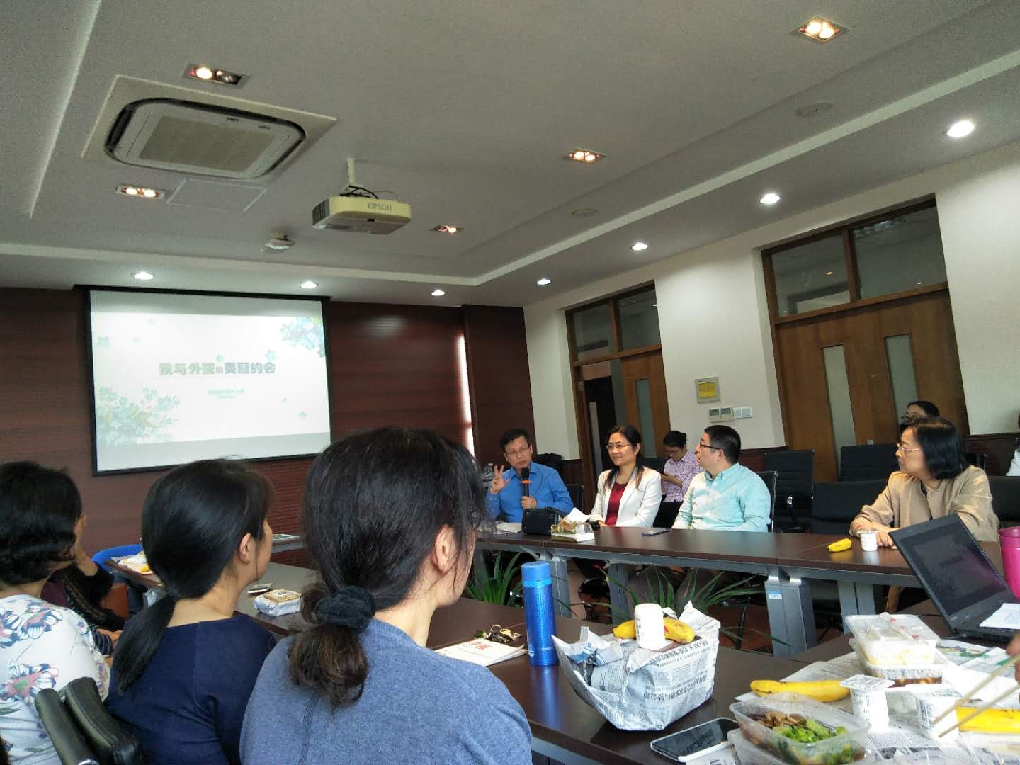 自由交谈后,在轻快愉悦的氛围下,胡开宝院长发言。他围绕着资金与师资两大议题,将外院近年发展历程中碰到的困难与瓶颈是如何被逐一发现、分析与解决的娓娓道来,并分享了作为一院之长的酸甜苦辣。院长非常平易近人的发言让大家充分了解了学院未来发展的规划与蓝图,更让大家深切体会到学院上水平背后的艰辛与不易。陶庆副院长则站在外语人的角度,对外语教学的两个基本命题“外语教学费时低效”、“外语教学工具性与人文性”和评教问题展开了辩证看待、理性分析和深度探讨。两位院长的真诚讲述激起了大家的强烈共鸣。时光飞逝,在动情的讲述与侧耳的倾听中,时钟指向了下午一点半,该继续工作了。大家纷纷表示,这样的讲述与分享太值得了,遂相约以后再叙。