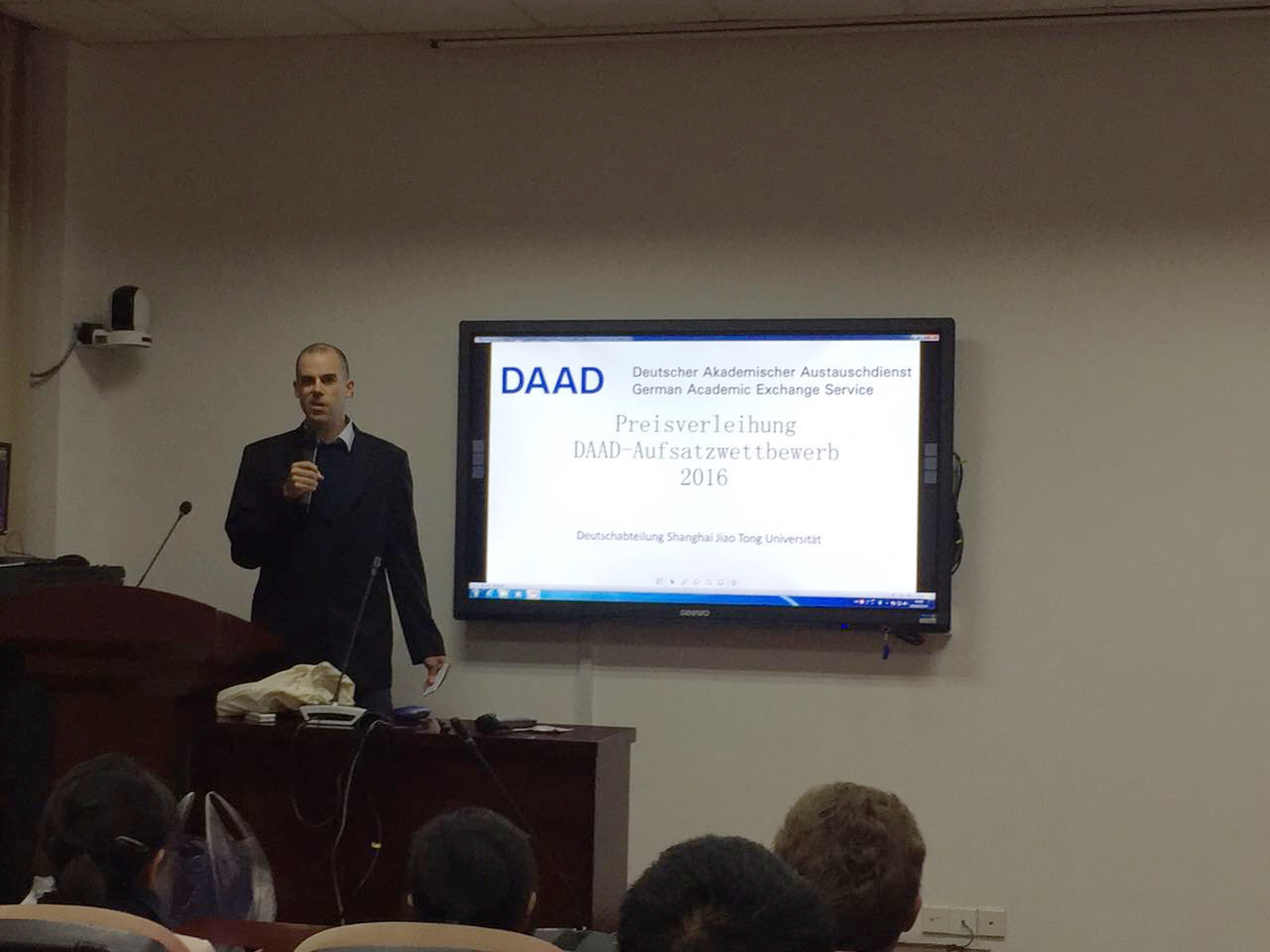 此次颁奖晚会主要流程为德语系系主任张鸿刚教授致辞,DAAD 专家Marc Esser介绍奖品内容,获得一等奖的三位学生朗读获奖作文。所有奖品中令人印象深刻的是著名德语作家Ursula Krechel于2008年出版的著作《Shanghai fern von wo》以及Wolfgang Herrndorf于2010年出版的《Tschick》。