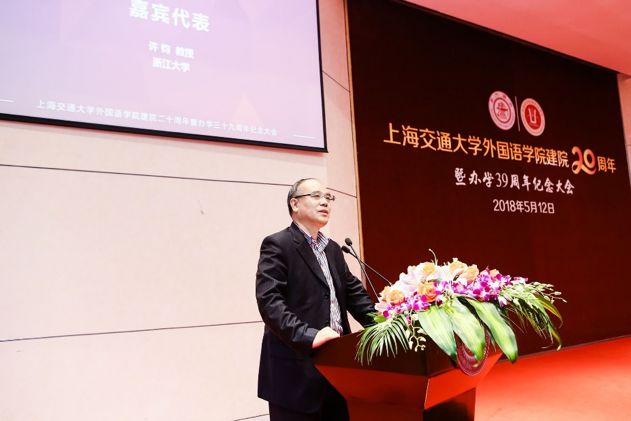 浙江大学文科资深教授、国务院学科评议组召集人许钧教授作为一位热爱外语学科,献身外语学科的老外语人,为上海交大外语学院办学39周年献上最热烈的祝贺。外院以改革进取的精神,敢为天下先,与日俱进,取得了令外语界同行注目和称赞的辉煌成就。同时,许钧教授提出几点希望,希望外语界同心协力,打造世界一流的外语学科;希望上海交大外语语言文学学科不忘初心,扎根中国大地办学,培养为实现中华民族伟大复兴作出贡献的合格的社会主义接班人;积极进取,求真务实,走国际化办学道路,真正让外语学科在人文学科中推进思想创新,拓展思想疆域,为国家的伟大复兴培养出优秀的人才。