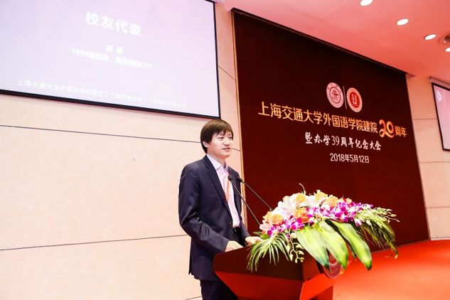 科技外语系1994届校友、智联招聘CEO郭盛代表学院的各届毕业生向学院的20周年华诞表示祝贺,向学院师生和广大校友问候祝福。他讲述了自己在学校的经历,特别向几位对自己影响最大的教师表示感谢,同时期望在校生们一定要珍惜在上海交大新葡萄8883官网AMG官网的学习经历,找到自己的长处并把它发挥到极致。