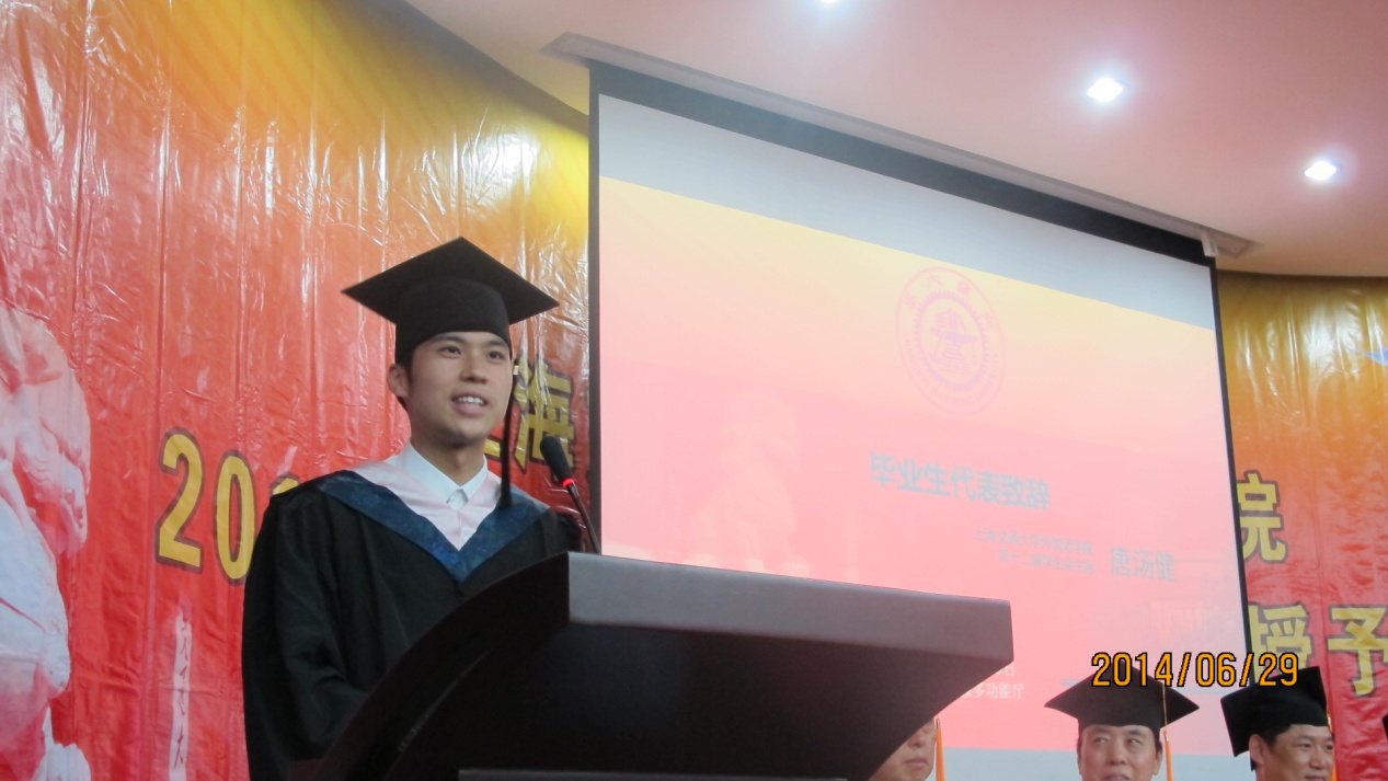 毕业生代表、前学生会主席、日语系唐汤健在发言中回顾四年大学生活的点点滴滴,酸甜苦辣都将成为同学们珍藏的记忆。