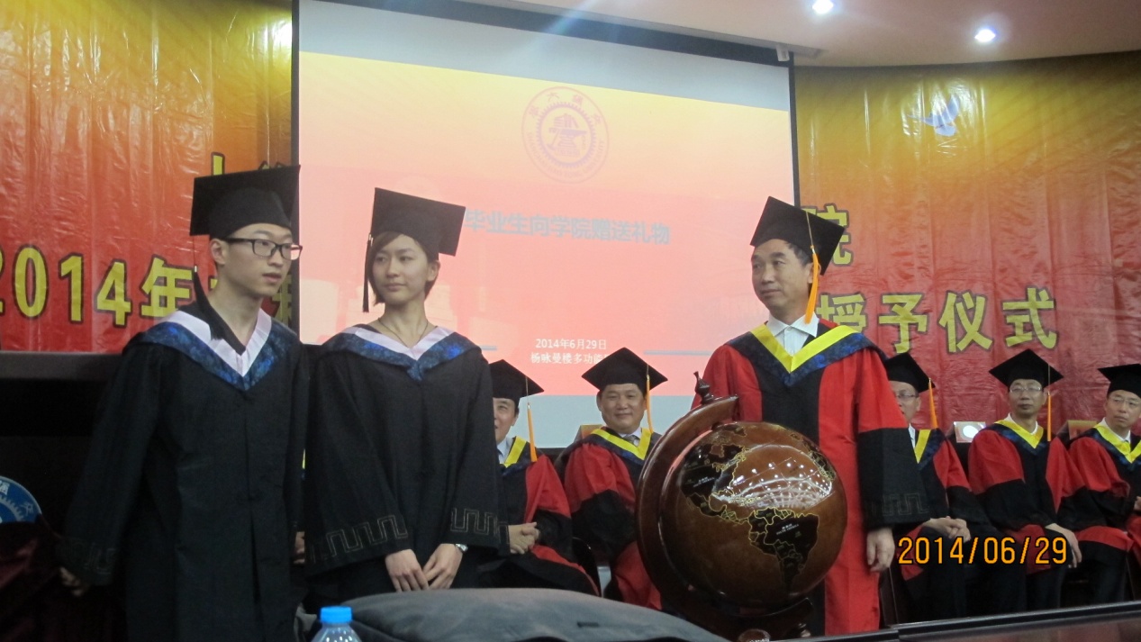 英语系罗洁、德语系吴秉亮代表2014届毕业生向学院赠送毕业礼物地球仪。取其寓意:自锦绣河山来,往天地八方去。