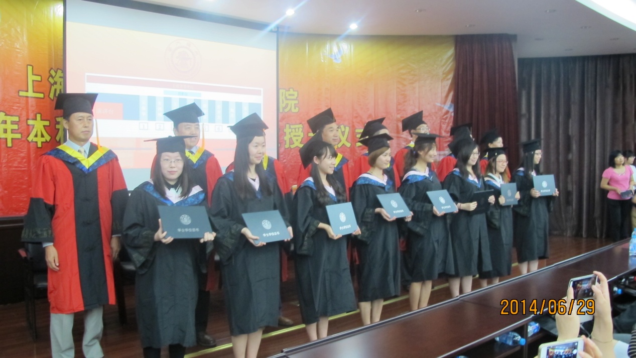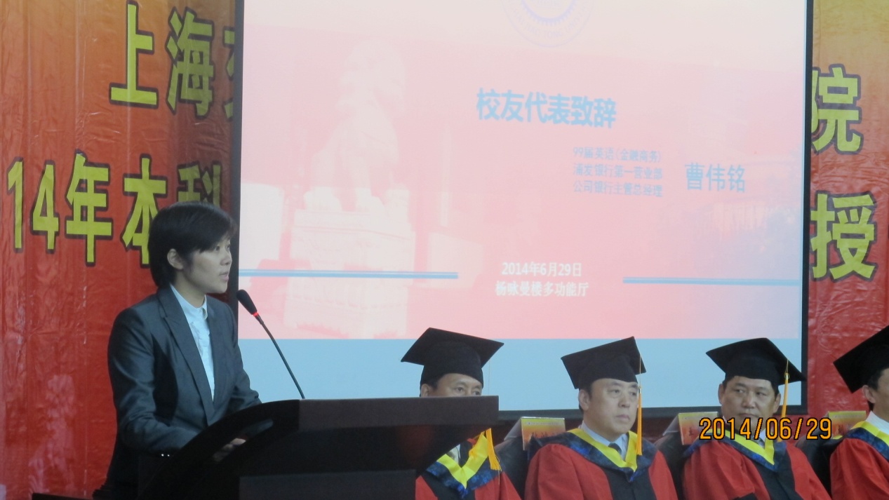 6月29日下午,新葡萄8883官网AMG官网2014届本科生毕业典礼暨学位授予仪式在杨咏曼楼多功能厅举行。新葡萄8883官网AMG官网院长胡开宝,党委书记刘龙根,副院长彭青龙,院长助理陶庆,英语系系主任王振华,日语系系主任吴保华,德语系系主任张鸿刚,英语系教授朱小燕,1993届校友代表刘飞,1999届校友代表、浦发银行第一营业部公司银行主管总经理曹伟铭出席了会议。学院部分教师及2014届本科毕业生及家长共同参与仪式。