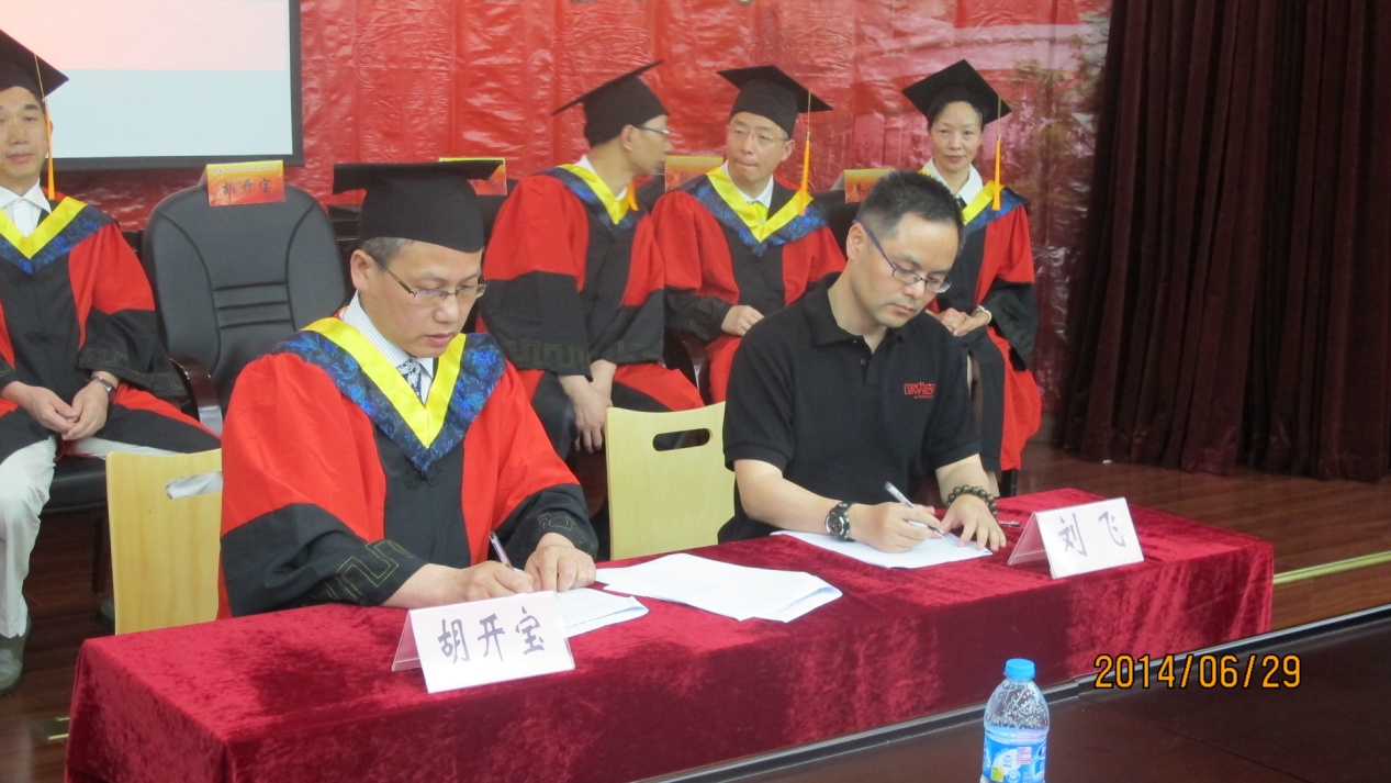 毕业典礼上还举行了校友基金启动仪式,刘飞与胡开宝签署协议。