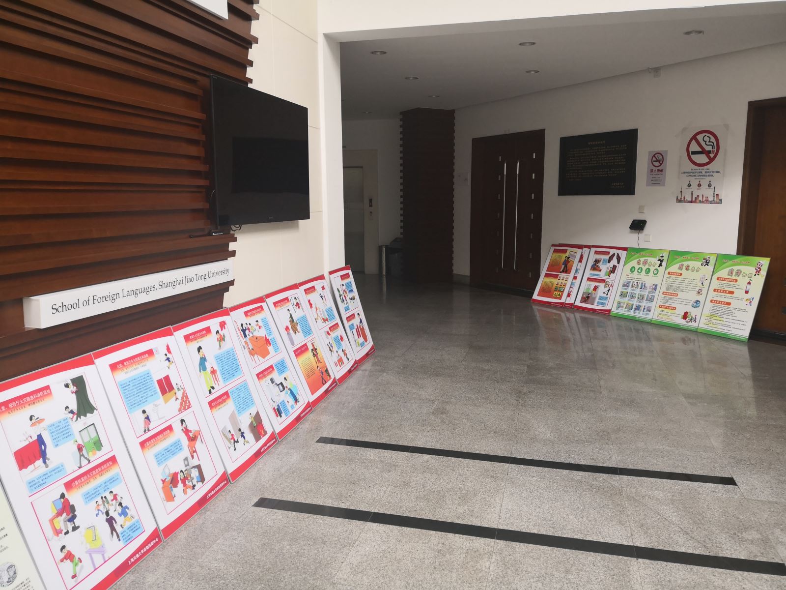 演练的前一周,后勤闵行物业部制作了有关火灾隐患和消防须知的宣传展板,置于杨咏曼楼的门厅,以便师生们了解和学习相关消防知识。