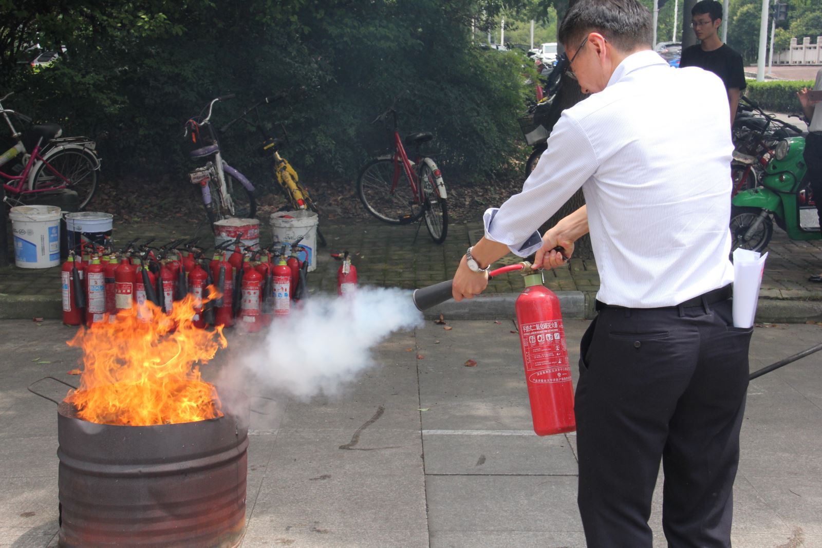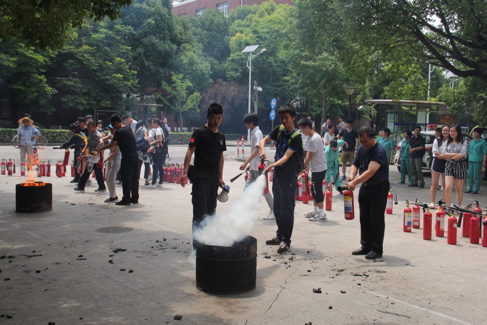 随后,全体人员来到外语楼外西广场,开始模拟灭火演练。消防科的老师讲解了灭火器的使用方法并进行演示后,正如同这炎热的天气,师生们热情高涨、积极认真地参与演练,快速、有效、安全地完成了灭火练习,获取了关于灭火的第一手感性认识。