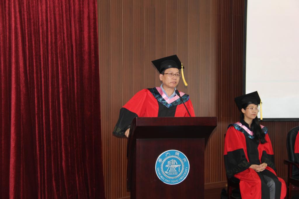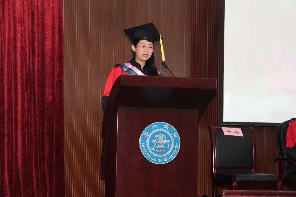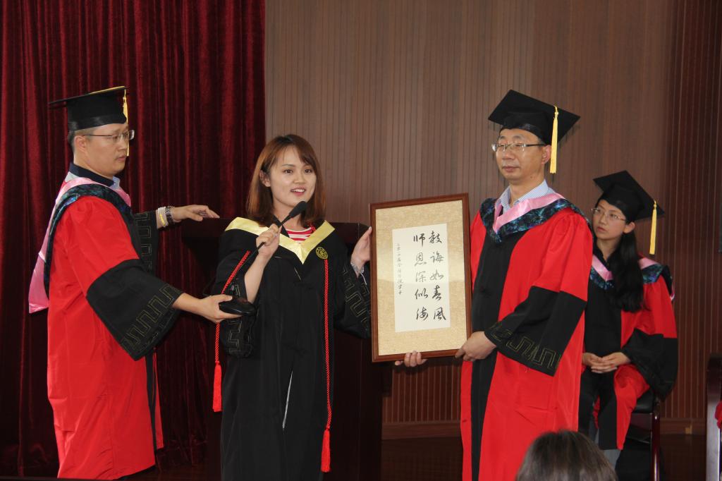 毕业生代表英语系虞涌代表全体毕业生对母校和老师表达了诚挚的敬意与感谢,自己很幸运见证了交大思念的变化,而交大也见证了自己四年的成长,给了毕业生们实现梦想的能力。怀寸草之心,抒感恩之情,做胸怀大志、脚踏实地的人。她代表毕业生向学院献上礼物:一幅写有“教诲如春风,师恩深似海”的书法作品。