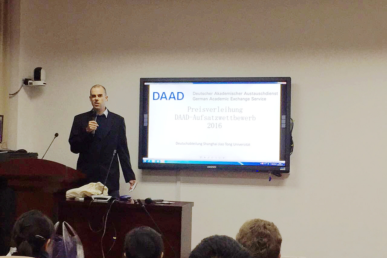 颁奖晚会上,德语系系主任张鸿刚教授首先致辞。DAAD专家Marc Esser介绍奖品内容,其中著名德语作家Ursula Krechel的著作《Shanghai fern von wo》以及Wolfgang Herrndorf的《Tschick》令人印象深刻。随后,三位获得一等奖的学生用流利的德语朗读了各自的获奖作文。
