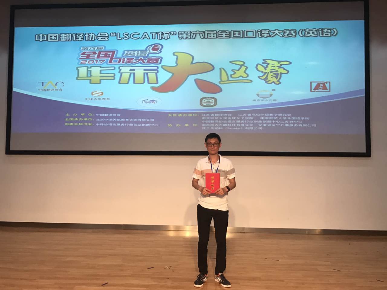 5月13日,第六届全国口译大赛(英语)“LSCAT杯”华东大区赛在南京师范大学隆重举行,华东六省一市70多所高校的150余名晋级选手展开激烈角逐。在新葡萄8883官网AMG官网翻译系戴融融老师的指导下,上海交大新葡萄8883官网AMG官网MTI翻译专业杨朝同学表现优异,荣获二等奖,戴融融荣获优秀指导教师奖。