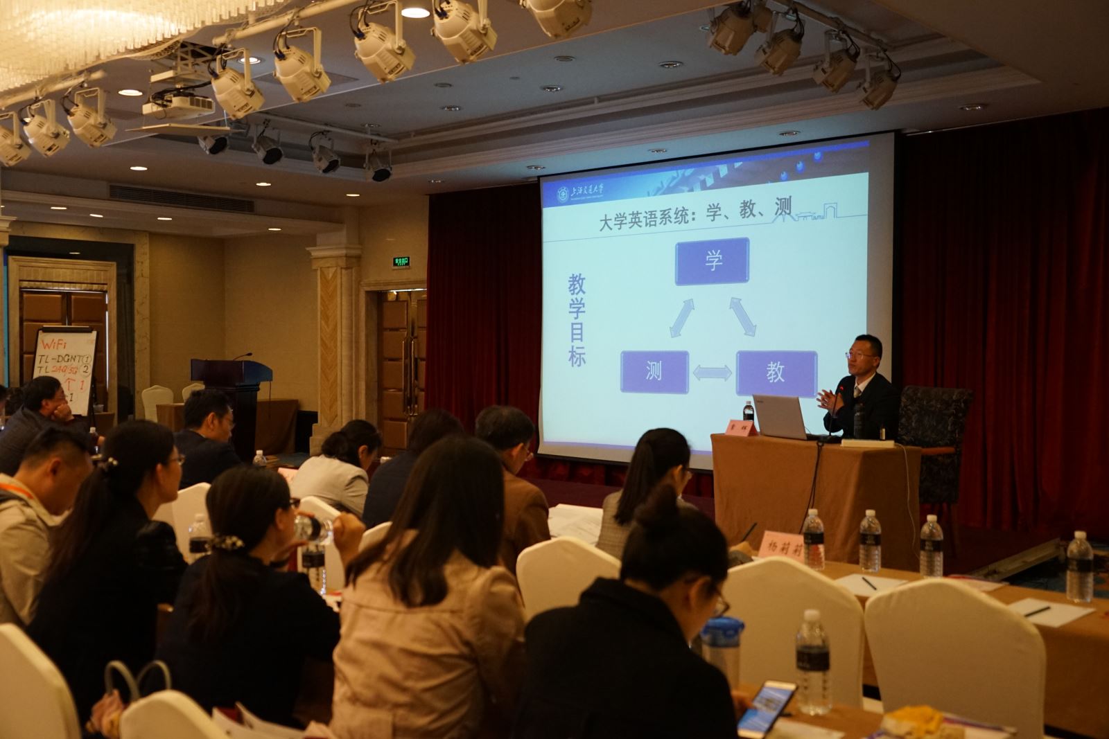 27日演讲主题分别为:校本测试与大学英语教学、英语能力构念与校本测试、听力、阅读、写作、口语命题原则与试题命制、新葡萄8883官网AMG官网英语水平考试口语机考展示、新葡萄8883官网AMG官网英语水平考试笔试在线系统展示以及校本测试词表研发。其中,新葡萄8883官网AMG官网教授、博士研究生导师、副院长常辉在“校本测试与大学英语教学”的发言中,首先阐述了大学英语的三个必要环节:学、教、测,并阐述其之间的关系。之后以新葡萄8883官网AMG官网英语水平考试为例,介绍了校本测试在大学英语中的“抓手”作用,以及如何利用校本测试全面提升大学英语教学,服务学校的人才培养。