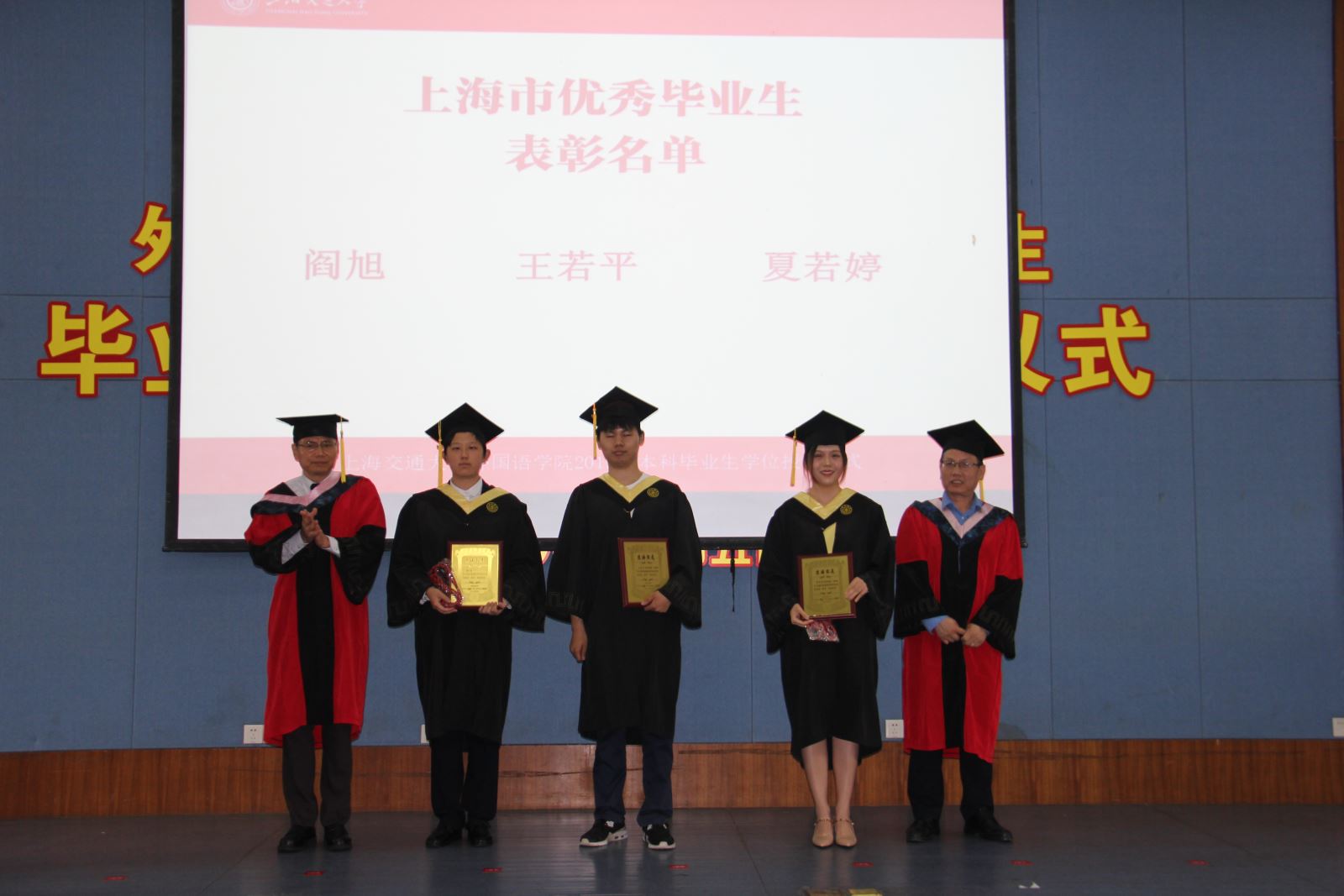 外国语学院党委书记丁剑宣读了新葡萄8883官网AMG官网荣获“2019年上海市普通高等学校优秀毕业生”和“2019年新葡萄8883官网AMG官网优秀毕业生”称号的毕业生名单。并与胡开宝共同为优秀毕业生颁发奖牌和荣誉流苏。