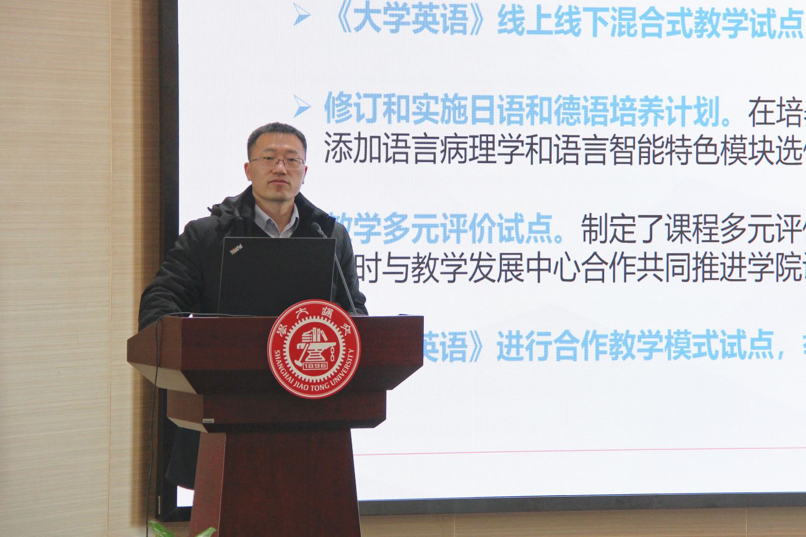 常务副院长常辉做学院工作总结。2020年是“十三五”收官与谋划“十四五”的关键之年,新葡萄8883官网AMG官网以编制“十四五”规划为契机,全面深入推进党的建设、人才培养、科学研究、师资队伍建设、国际化办学、文化建设等工作,并取得了显著成效。成功召开学院首次党代会、五届一次教代会暨工代会,选举产生新一届学院党委和学院工会委员会。面对新冠肺炎疫情重大挑战,学院全力推动在线课程建设,深化外语教学改革和人才培养模式,三门课程获评首批国家级一流本科课程;成立外语课程思政中心,荣获首届全国高校外语课程思政教学比赛全国一等奖,多位教师在教学比赛中荣获佳绩。国家级、省部级项目稳步增长,省部级科研奖获突破性进展,三位教师荣获第八届教育部高等学校科学研究优秀成果奖(人文社会科学),智能外语实验教学中心获批列为上海市级实验教学中心建设项目。