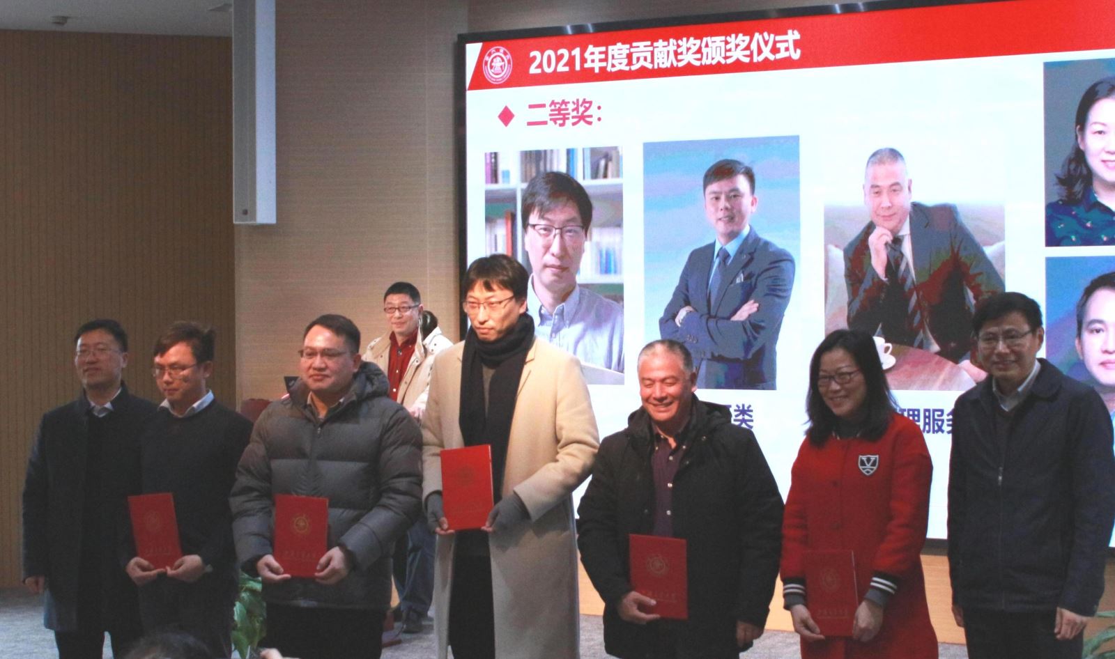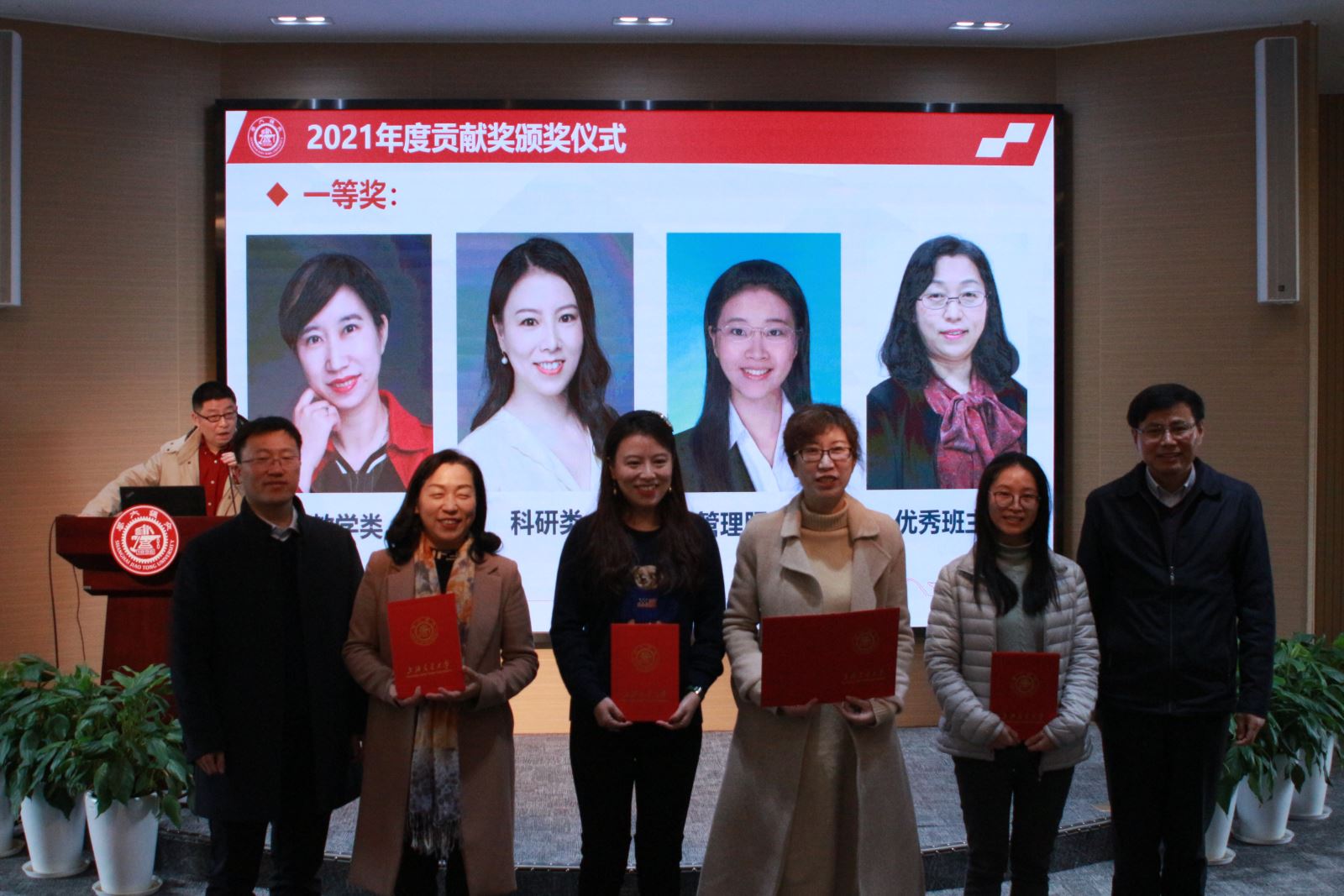 为表彰2021年在教学、科研、管理服务、班主任等一线工作做出突出贡献、并起到示范引领作用的先进教师,会上举行了学院年度贡献奖表彰颁奖仪式。曹慧、吴攸、余敏、金文峰等四位教师分别荣获年度贡献奖一等奖;王品、邹理、杨枫、林玉珍、赖良涛等五位教师分别荣获学院年度贡献奖二等奖。