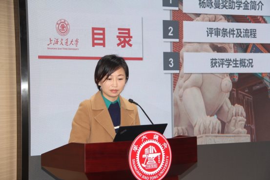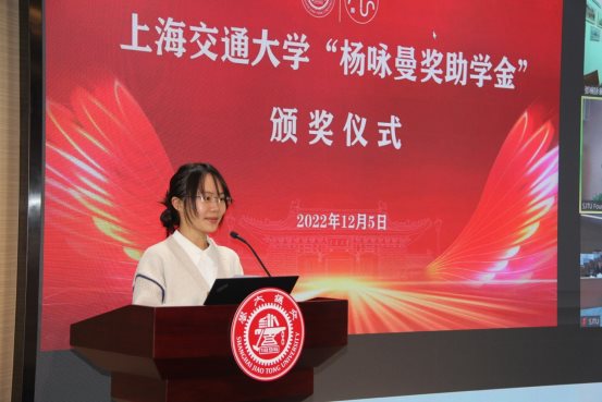 杨咏曼校董感谢学院的精心安排,对本届获奖获助学生表示祝贺。她对所有获奖学生现阶段的科研工作与成果表示肯定,她也期待同学们能够学有所成,日后成长为可以报效家国的栋梁之才。杨校董盛赞交大近年来对人才培养工作做出的努力与成绩,在听到交大办学实力及国际排名的进一步提升的消息时,倍感振奋,与有荣焉。她也希望获奖同学在今后的学习工作中,能够抓住机遇,在成就自我的同时,做一个有骨气的中国人,主动回馈祖国,报效国家,为社会,为母校做出应有的贡献。杨校董祝同学们学业进步,身体健康,新春快乐。
