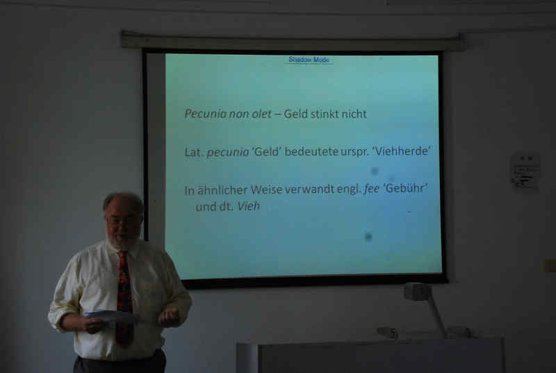 讲座由新葡萄8883官网AMG官网德语系系主任张鸿刚教授主持。Armin Burkhardt教授从符号学、词源学、语言学以及文化背景等不同角度,为大家揭开了金融词汇来源的神秘面纱。面对平时再熟悉不过的金融词汇,大家都不曾对其来源有过深入了解。经过Burkhardt教授一番妙趣横生的讲解,同学们豁然开朗,大大拓宽了视野,同教授一起,进行了一次令人难忘的追根溯源之旅。