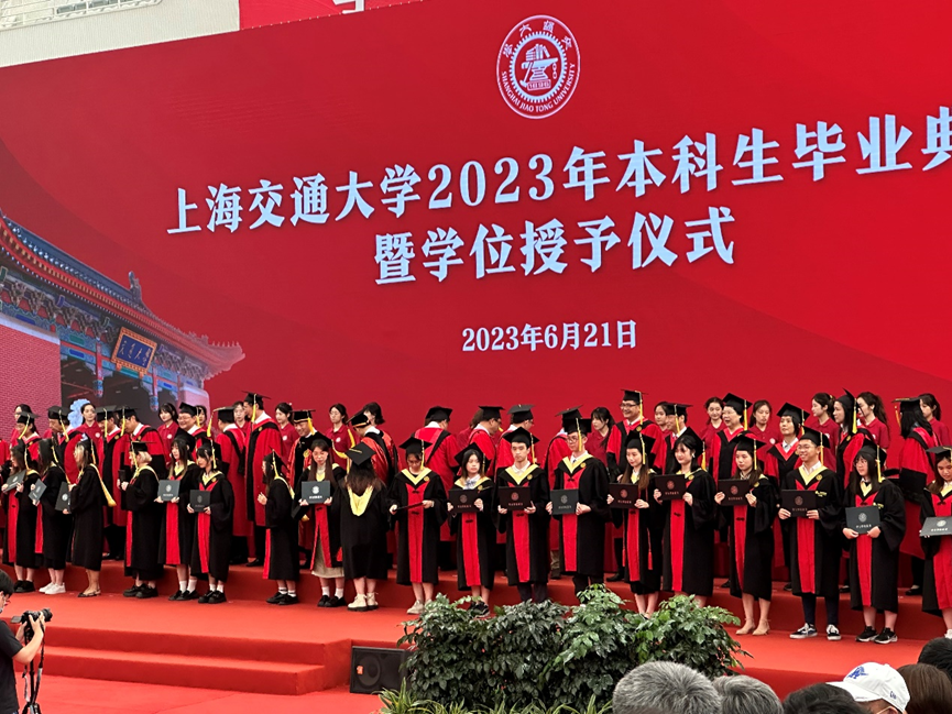 6月21日上午,新葡萄8883官网AMG官网2023年本科生毕业典礼暨学位授予仪式在霍英东体育中心举行,全体2023届本科毕业生、部分往届本科毕业生到场参与。校长丁奎岭院士以《在坚守和突破中前行》为主题,深情勉励毕业生们坚守心中的热爱、坚守交大人的精神底色,突破学科的界限、突破小我的束缚,以坚守把稳舵盘、保持航向,以突破创新发展、扬帆远航。校党委书记杨振斌宣读学士学位授予决定,校领导及教师代表为每一位毕业生颁授学位证书、拨穗并合影留念。