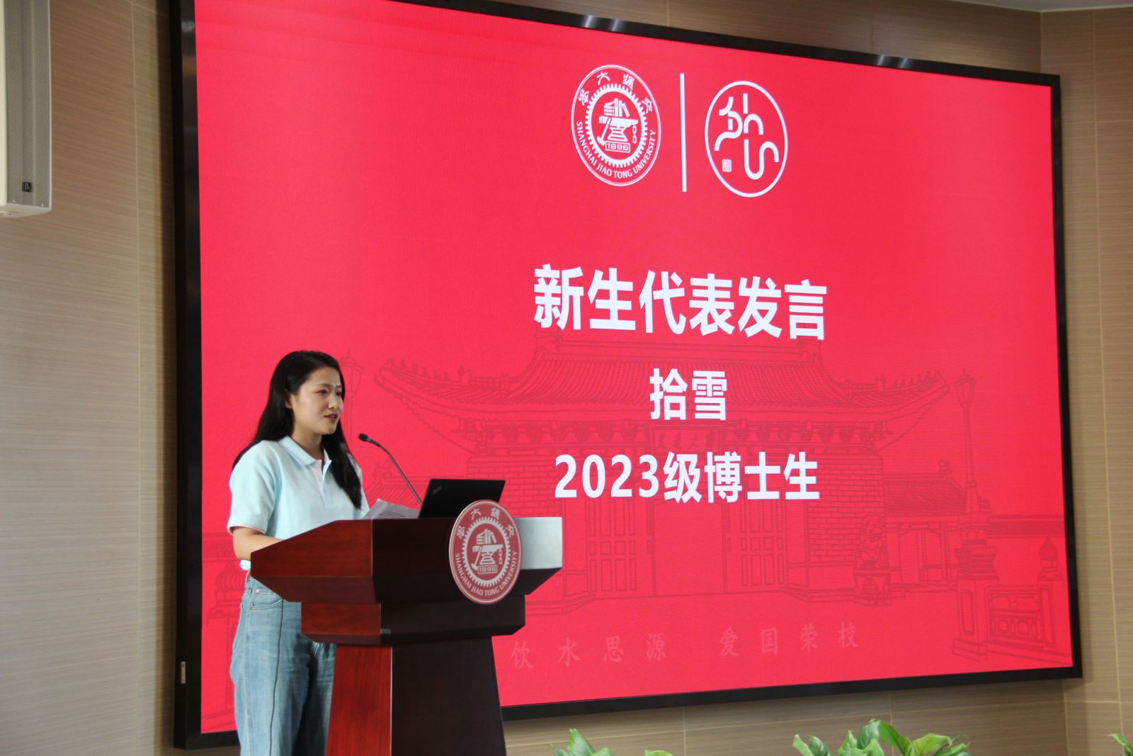2023级翻译硕士任灏然、博士生拾雪代表新生发言。任灏然结合本科阶段在外院的求学经历,期待同学们扎根中西碰撞前沿、品咀学科交叉魅力,坚定文化自信,攻坚“急难愁盼”,为“中华文化世界听”的宏伟蓝图贡献外院力量。拾雪则从踏上外语道路的初心谈起,与同学们共勉“既见高山,勿止坦途”,希望同学们勿忘来时的初心与汗水,争做学术道路上永远滚石上山、永怀赤诚热爱的西西弗斯。