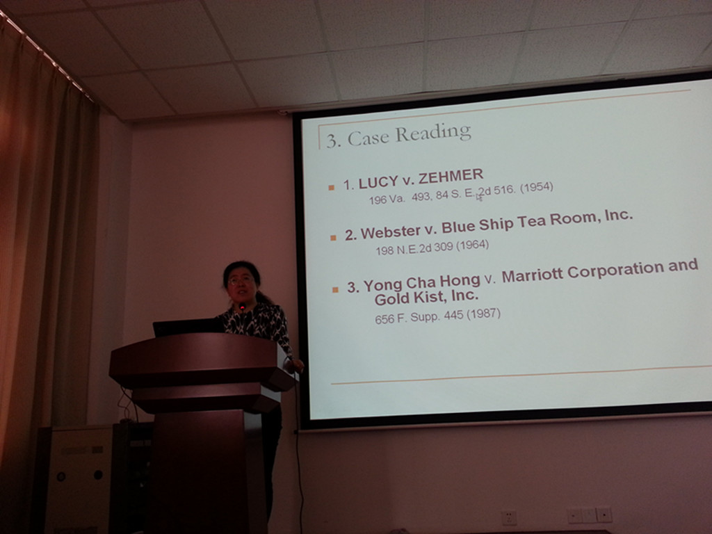 在报告中,沙教授首先介绍普通法系中判决书(judicial opinion)的种类,包括多数意见(majority opinion)、反对意见(dissenting opinion)和附随意见(concurring opinion),然后指出判决书的结构包括案件综述、历审程序、事实陈述、法律争端以及法律推理,其中法律推理程序包括演绎推理(deductive reasoning)和类比推理(analogical reasoning)两种。沙教授以案说法,重点讲解了演绎推理及其步骤。此外,沙教授还详细介绍了如何撰写案例摘要。下午2点,沙教授以Webster v. Blue Ship Tea Room, Inc.判决书为例,详细讲解了如何进行案例教学。
