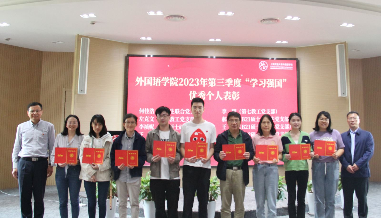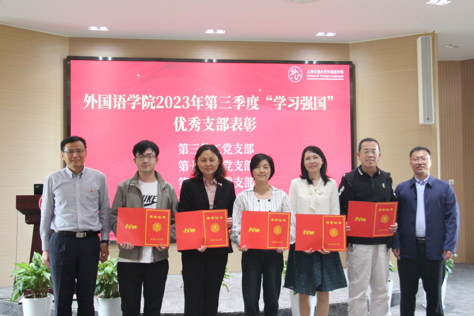 会上,对学院2023年第三季度“学习强国”平台学习先进表彰决定。第三教工党支部、第七教工党支部、第一教工党支部、第六教工党支部和本科生联合党支部荣获“学习先进党支部”;左克文、王星、沈悠、李玥、邢连清等教工党员及何佳浩、李祯妮、郝思涵、王慧、李天怡等学生党员荣获“学习积极分子”称号。丁剑和常辉为获奖师生颁发证书并合影留念。