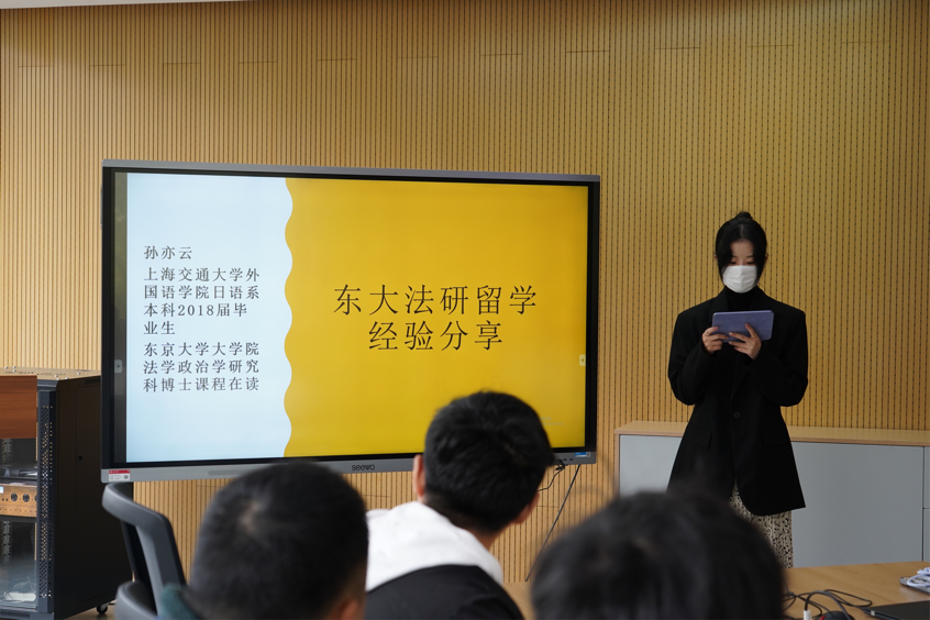 孙亦云学姐是新葡萄8883官网AMG官网日语系本科2018届毕业生,现于东京大学大学院进修法学政治学研究科博士课程。孙亦云学姐为大家介绍了东大法研与博士阶段的课程内容及研究方向,也对报考前所需的准备及报考流程做了详细说明,强调了N1证书和研究计划书是最为关键的两份文件,要提前做好准备。最后,学姐也分享了自己的留学生活,为我们整理和介绍了一些留学相关的手续及奖学金申请方面的事宜。