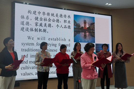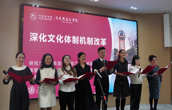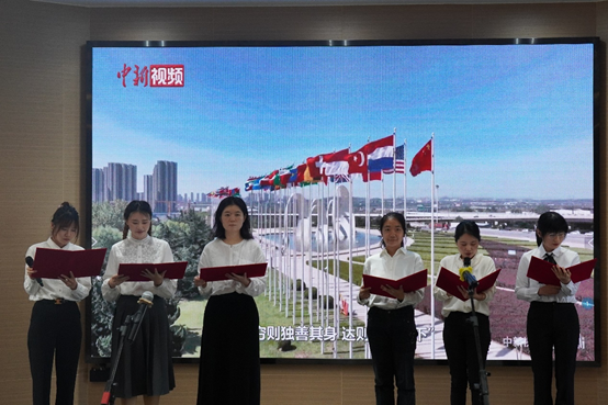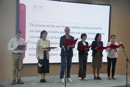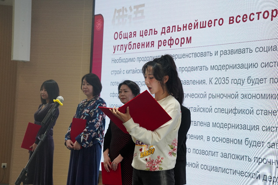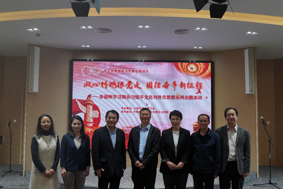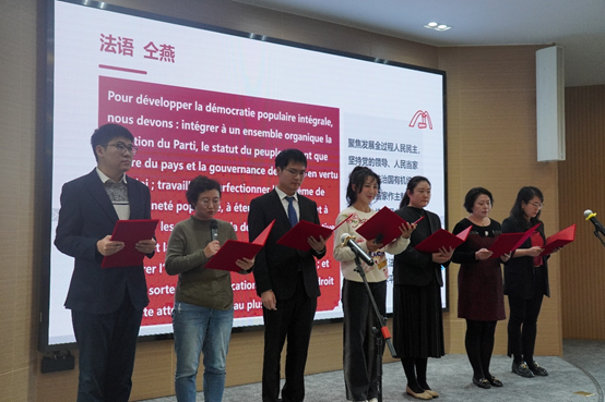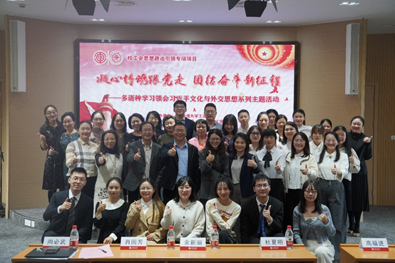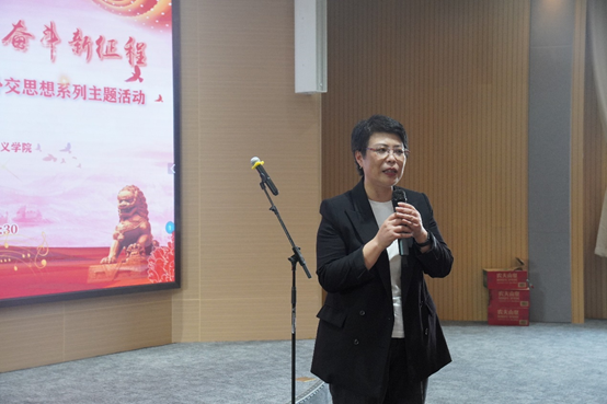余新丽指出,本次活动的特色在于多语种学习领会“习近平文化思想+习近平外交思想”,用中、英、日、法、德及俄等多语种朗诵和学习,老师们必定会在严肃认真的理论学习和生动活泼的诵读中,获得真切的内涵和精髓。她对本次活动组织工作表达谢意,特别感谢两个学院的密切成功的合作和辛勤付出,也相信通过这一特别的活动,能够进一步激励两个学院教职员工在本职工作中爱岗敬业、奋发有为、勇攀高峰,为学校一流大学建设做出更大贡献。