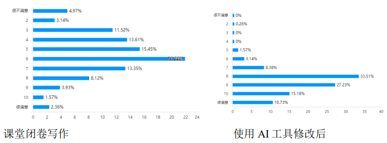 AI辅助写作有力提升了学生的英文写作信心。课堂闭卷完成的 Report 写作自我满意度平均分为 4.45(满分10分),使用AI工具修改后提交的Report写作自我满意度平均分则飙升至7.69,说明学生对使用AI工具辅助英语写作的认可度极高。信心指数≥6的学生占比从10.72%增至66.14%,写作焦虑大幅缓解。