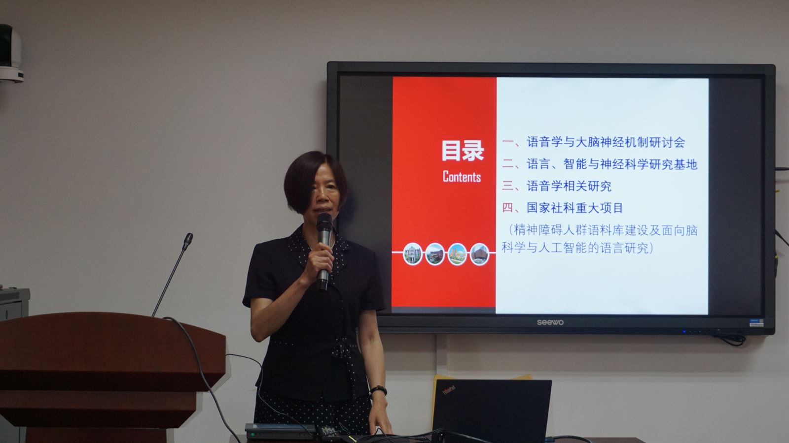 After the opening ceremony, Professor Ding Hongwei from the Language, Intelligence and Neuroscience Research Base of Shanghai Jiao Tong University introduced the interdisciplinary research cooperation on phonetics at home and abroad, including the development of the seminar on phonetics and brain neural mechanism; the Intelligent and Neuroscience Research Base; the Speech-Language-Hearing Center; as well as the physical layout and display area of the base. Then Prof. Ding introduced her team's national social science project, namely “the Construction of Corpus for Mental Disorders and the Language Research for Brain Science and Artificial Intelligence”, which focused on the development of early diagnosis techniques for mental disorders based on linguistic features, and accelerating the transformation of scientific research and application. It plans to achieve international leading results in three frontier fields of brain science, the early diagnosis and intervention of brain disease, and artificial intelligence.