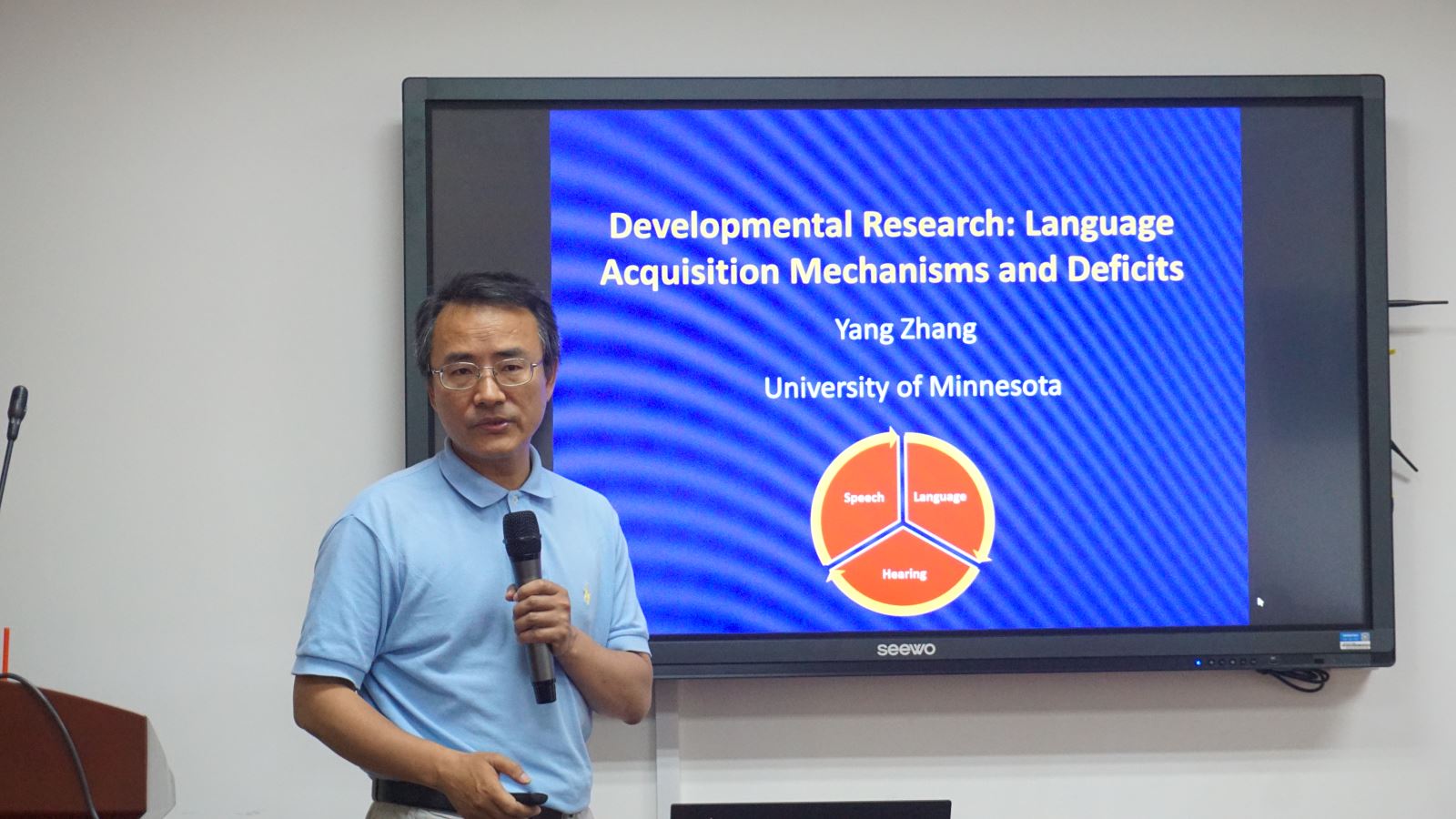 Professor Yang Zhang from University of Minnesota gave speeches on “Developmental Research: Language Acquisition Mechanisms and Deficits”, “Brain Mechanisms and Plasticity Associated with Sensory Degradation and Impairments”, and “Perceptual Bias & Experiential Factors”. After a general introduction of the structure of linguistic theory from 1955 to 1975, he went to the core of his study - the development of hearing and speaking, which has gone through the linguistic level, the physiological level, the acoustic level, and back to linguistics. For researches in this field, subjects are categorized into monolingual or bilingual, child or adult, and normal or pathological, with the objects-oriented containing sounds, faces, or words. In data acquisition and analysis, brain activities have been taken into consideration with the aid of ERP, EEG, or MEG, etc., and examples of the application of measures to different emotional prosodies in infants and adults were given, which can provide another perspective for research interpretation. As for hearing impairment (HI), he found that it significantly affects certain neural processes by age, speech in noise, and so on.