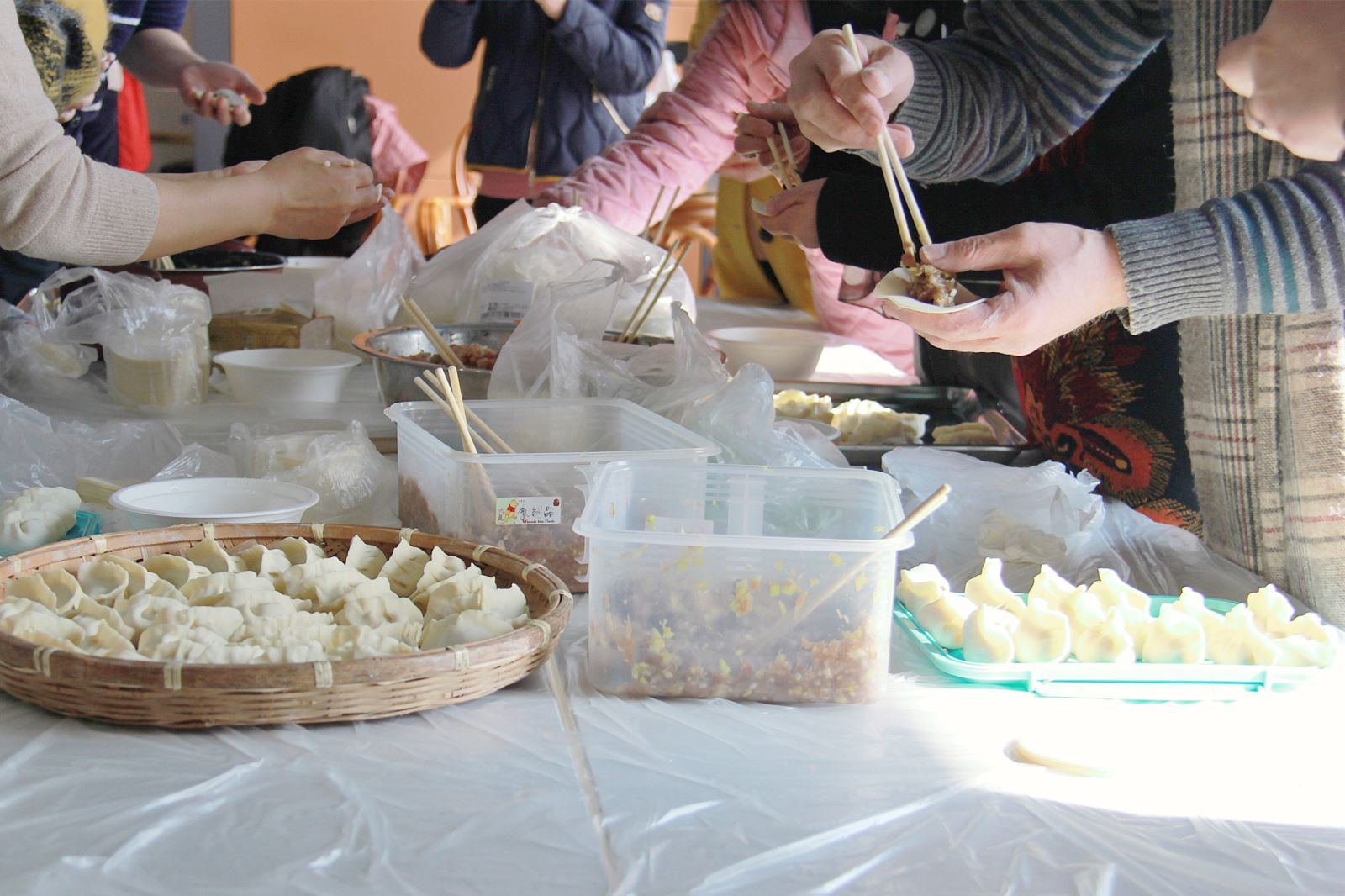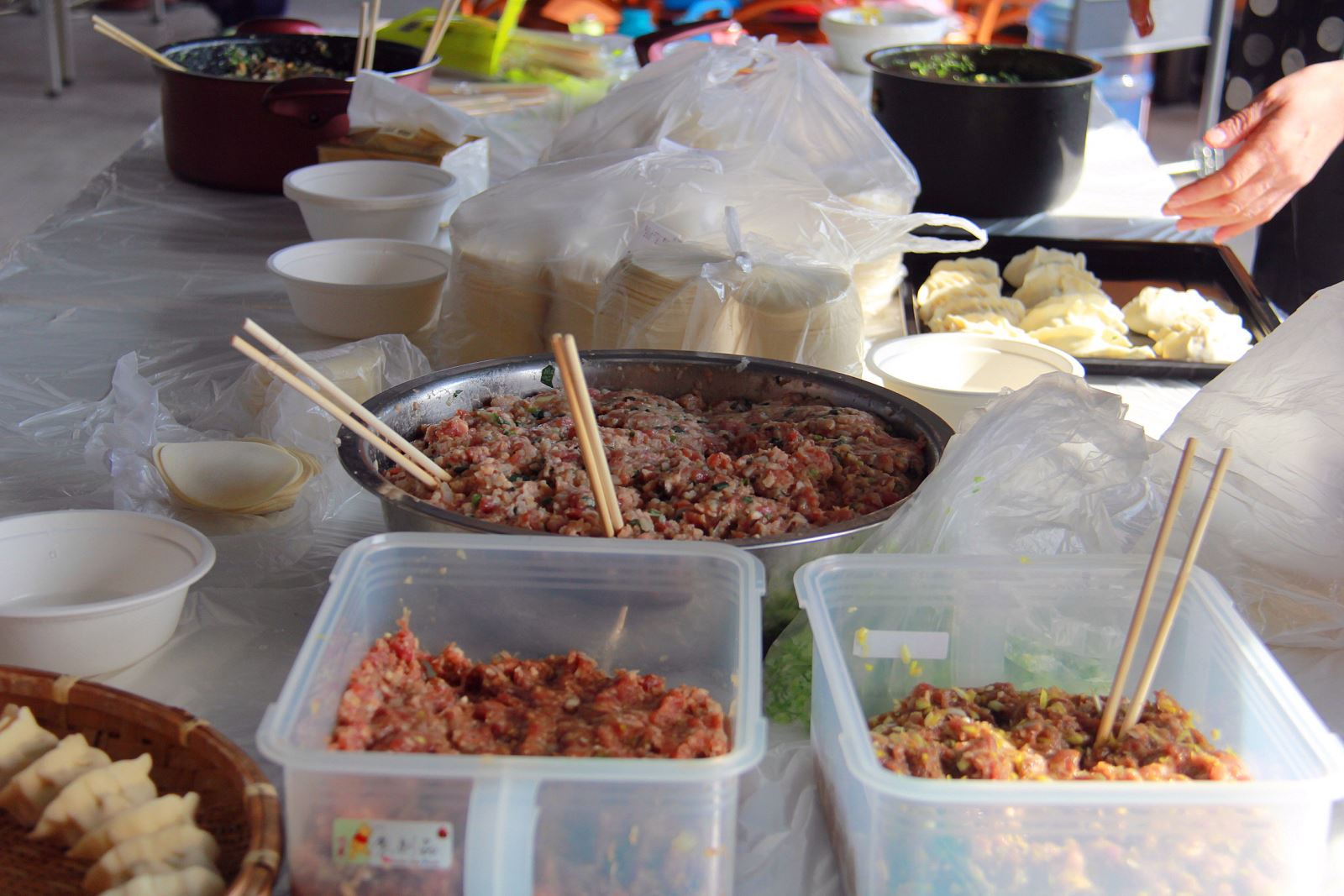 Five pots of fillings of pork and lotus root, pork and shepherd's purse, shrimp meat and eggs, pork and Chinese Chives, beef and carrots, respectively, were displayed on a long table, ready to be made into Jiao Zi.