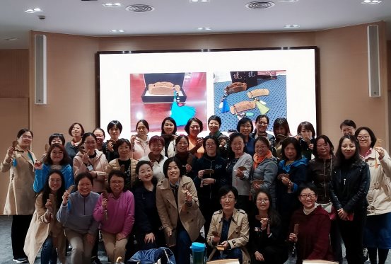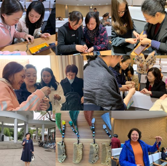 After listening to the instructor's introduction, the teachers were eager to try, holding the tools and materials, and observing the exquisite wooden comb emitting the fragrance of sandalwood. With the guidance of the instructor, in groups of three, the teachers, first of all, produced a 3 centimeter-long Bird's Head Knot by using double-headed colored thread. Then, by using a single-headed short thread, one and one, they stringed together cloisonne small seat, single spacer, white beads, double spacer, colored round beads, double spacer, white beads, lotus round beads. As a finishing touch, they hung a crystal-clear chalcedony, then burned and melted the thread end. By now, an exquisite pendant was ready. The final step was to use a Bird's Head Knot to weave the tassel onto the pendant and it was done.