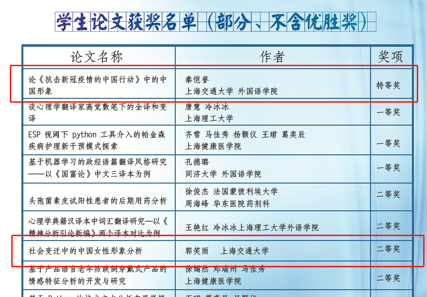 On December 4, 2021, the 5th ESP Interdisciplinary Innovative Youth Forum, which was hosted by Shanghai Science and Technology Translation Society kicked off online, announcing the award winners. Nearly 520 experts from research institutes and young scientists from enterprises and institutions participated in the pre-call for papers. Finally, with the careful guidance of Mr. Guan Xinchao, Qin Kaiyu, a second-year Master of Translation from the Department of Translation, School of Foreign Languages, Shanghai Jiao Tong University, won the only Grand Prize in the student category of this forum, and Guo Xiaoyu, a fourth-year undergraduate student from the Department of English, School of Foreign Languages, won the second prize in the student category.