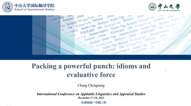 Prof. Chenguang Chang gave a speech entitled "Packing a Powerful Punch: Idioms and Evaluative Force", which was chaired by Prof. Chengyu Liu. Prof. Chang compared and analyzed the evaluative force of Chinese idioms and English idioms and discussed the interpersonal effects amplified by different strategies categorized in APPRAISAL Systems.
