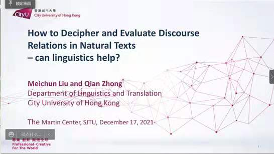 Prof. Meichun Liu gave a speech entitled "How to Decipher and Evaluate Discourse Relations in Natural Texts: can linguistics help?", chaired by Dr. Xiran Yang. The speech focused on the topic of discourse relations, which is a common concern in studies of linguistics and natural language processing. Based on the framework of Systematic Functional Grammar, the study identified four types of discourse relations: contingency, comparison, temporal, and interpretation. The identification and evaluation of implicit discourse relations made by linguistic features and their contribution to machine learning were also discussed.