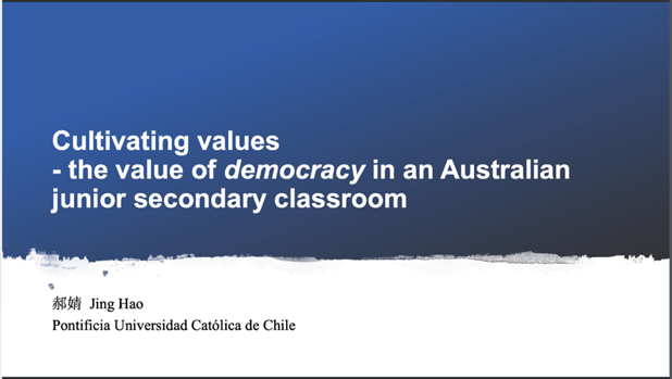 Dr. Jing Hao presented the speech "Cultivating Values: the Values of Democracy in an Australian Junior Secondary Classroom", and the session was chaired by Dr. Dongbing Zhang. The talk focused on the construction of knowledge in Australian junior secondary history education, and explored classroom interactions and the language resources used in the teaching materials aligning the students with the shared values of democracy.