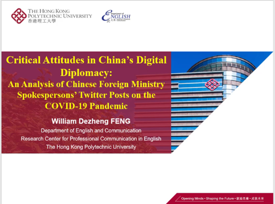 Associate Prof. Dezheng Feng gave a speech with the title of "Critical Attitudes in China's Digital Diplomacy: An Analysis of Chinese Foreign Ministry Spokespersons’ Twitter Posts on the COVID-19 Pandemic", chaired by Dr. Tao Qu. The study drew on Chinese Foreign Ministry spokespersons' Twitter posts as data, and analyzed the spokespersons' discourse strategies with ATTITUDE system as the analytical framework. It is found that the spokespersons used effective evaluative devices, rhetorical patterns, cognitive contrasts, and factual reasoning to forcefully counter the United States’ false statements.