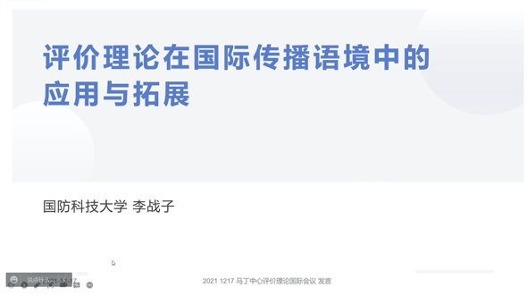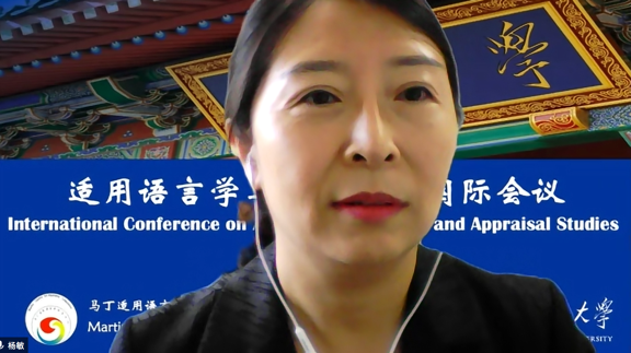 Prof. Zhanzi Li’s speech on "Application and Expansion of APPRAISAL Theory in the Context of International Communication" was chaired by Associate Prof. Changpeng Huan. The speech focused on the application and development of APPRAISAL studies in the new context of international communication. She proposed to draw on the concept of semantic gravity to develop evaluative gravity and make the evaluative features of discourse prominent, and put forward a research approach of analysing international communication discourse based on APPRAISAL theory.