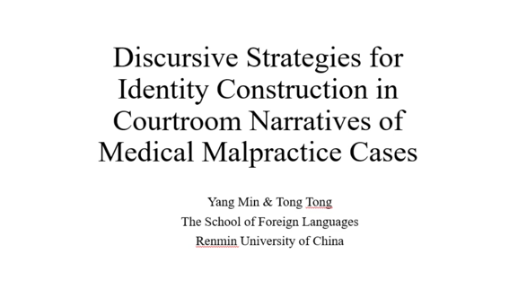Prof. Min Yang presented the speech "Discursive Strategies for Identity Construction in Courtroom Narratives of Medical Malpractice Cases", and Prof. Yuchen Xu chaired the session. The speech focused on the strategies adopted for identity construction in courtroom narratives of medical malpractice cases and constructed an analytical model. The study found that different identity construction models reflect the differences in making medical malpractice judgment, self-positioning, and power relations between doctors and patients.