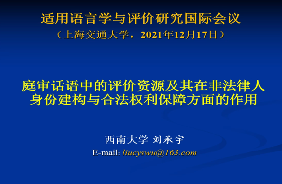 Prof. Chengyu Liu’s speech was entitled "Evaluative Resources in Courtroom Discourse and Their Roles in Constructing the Lay Person’s Identity and Legal Rights Protection", and was chaired by Dr. Pin Wang. Prof. Liu explored the functions of evaluative resources used by the courtroom parties when constructing their identities as non-legal persons and protecting their legal rights. The study highlighted the social accountability and appliability of APPRAISAL systems in the analysis of courtroom discourse.