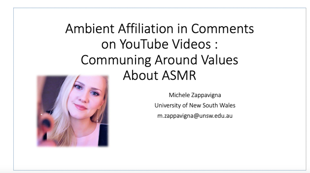 Associate Prof. Michele Zappavigna's speech was entitled "Ambient Affiliation in Comments on YouTube Videos: Communing Around Values About ASMR", and was chaired by Ms. Dongyan Wang. Her research investigated the ambient affiliation in YouTube comments of the "autonomous sensory meridian response" (ASMR)" community, focusing on the linguistic resources of ATTITUDE and IDEATION coupling, and proposed a value-sharing framework consisting of three systems of meaning: convoking, finessing, and promoting.