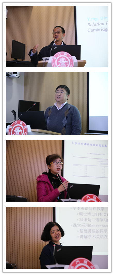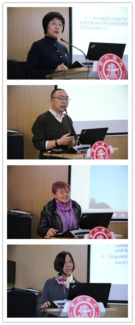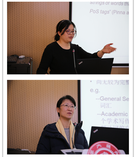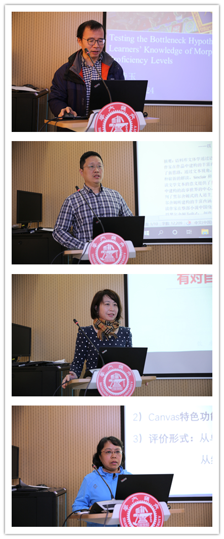 The first presentation of the Center came from Professor Shiyu Wu. Professor Wu discussed the bottleneck problems in English learning by Chinese English as a Foreign Language (EFL) learners across different proficiency levels. Associate Professor Fengchao Zhen's presentation was entitled “New Approaches to Corpus-Based Literary Research: Meaning Construction of Textual Object of "Hailsham" in "Never Let Me Go”. Ms. Yu Yang's presentation was entitled “A Questionnaire-Based Study of Chinese Japanese Learners' Acquisition of Corresponding Intransitive and Transitive Verbs Pairs". Associate Professor Lu Yuanwen's presentation was entitled "A Study on Peer Review Application Based on CANVAS Platform - A Case Study of College English Teaching". Associate Professor Chunyan Wang's presentation was entitled "A Study on the Teaching Model of 'Real-time Collaborative Online Text Editing' in College English Classroom". Prof. Lei Lei's presentation was entitled "Syntactic Complexity In Adapted Extracurricular Reading Materials". Prof. Yan Tian's presentation was entitled "A Complex Dynamic System Approach to Predict Learners' Online Translation Learning Behavior". Prof. Hongwei Ding's presentation was entitled "Speech Prosody in Mental Disorders". Prof. Bingjun Yang presented on "From Aristotle's Metaphor Theory to Halliday's Grammatical Metaphor". Associate Professor Xu Zheng's presentation was entitled “Chinese Morphology Revisited: A Perspective Based On Bloomfield's Original Definition of Morphology”. Associate Professor Cao Hui's presentation was entitled "Exploring on Ideological Work Strengthening and Political Awareness Raising in Foreign Language Courses Based on Students' Needs - A Discussion on the Application of Corpus to French Teaching". Associate Professor Lei Xiuyun's presentation was entitled "An Exploration of the Causes of Chinese Students' Deficiencies in English Writing Logic - An Introduction". Ms. Lin Ling's presentation was entitled "A Study of Lexical Sequences in Academic Texts". Ms. Zhao Hongyan presented "Notional Verbs in Academic Texts: A Corpus-Driven Study of Learners' Usage".