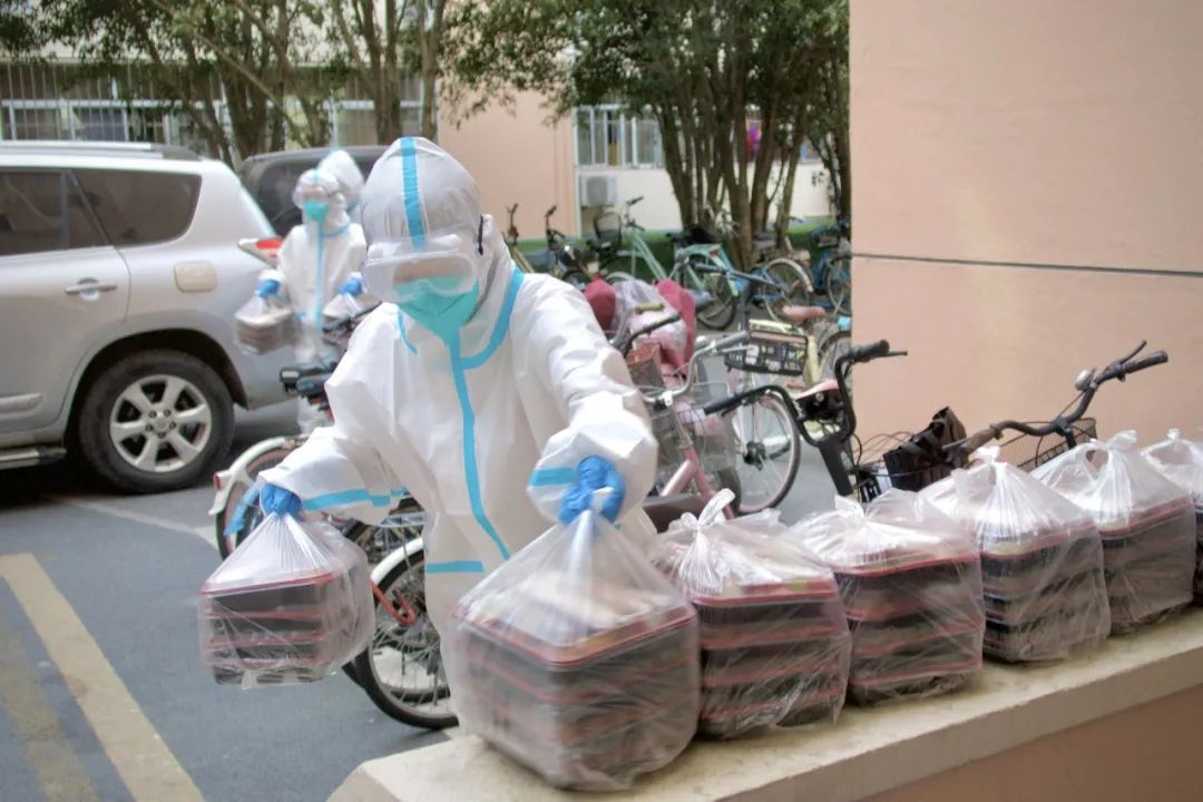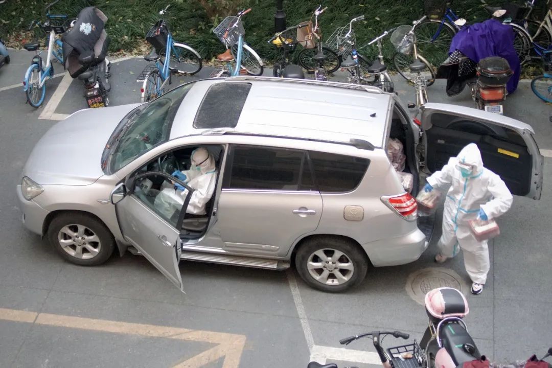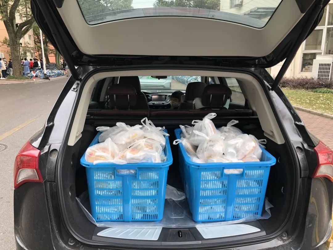 Teachers voluntarily drive their private cars to deliver meals to the dormitory buildings.