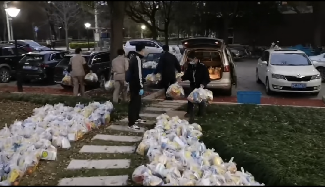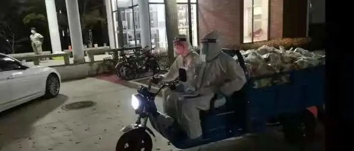 Wang Jinbo is carrying supplies into the building, as well as cleaners and security guards of the building.