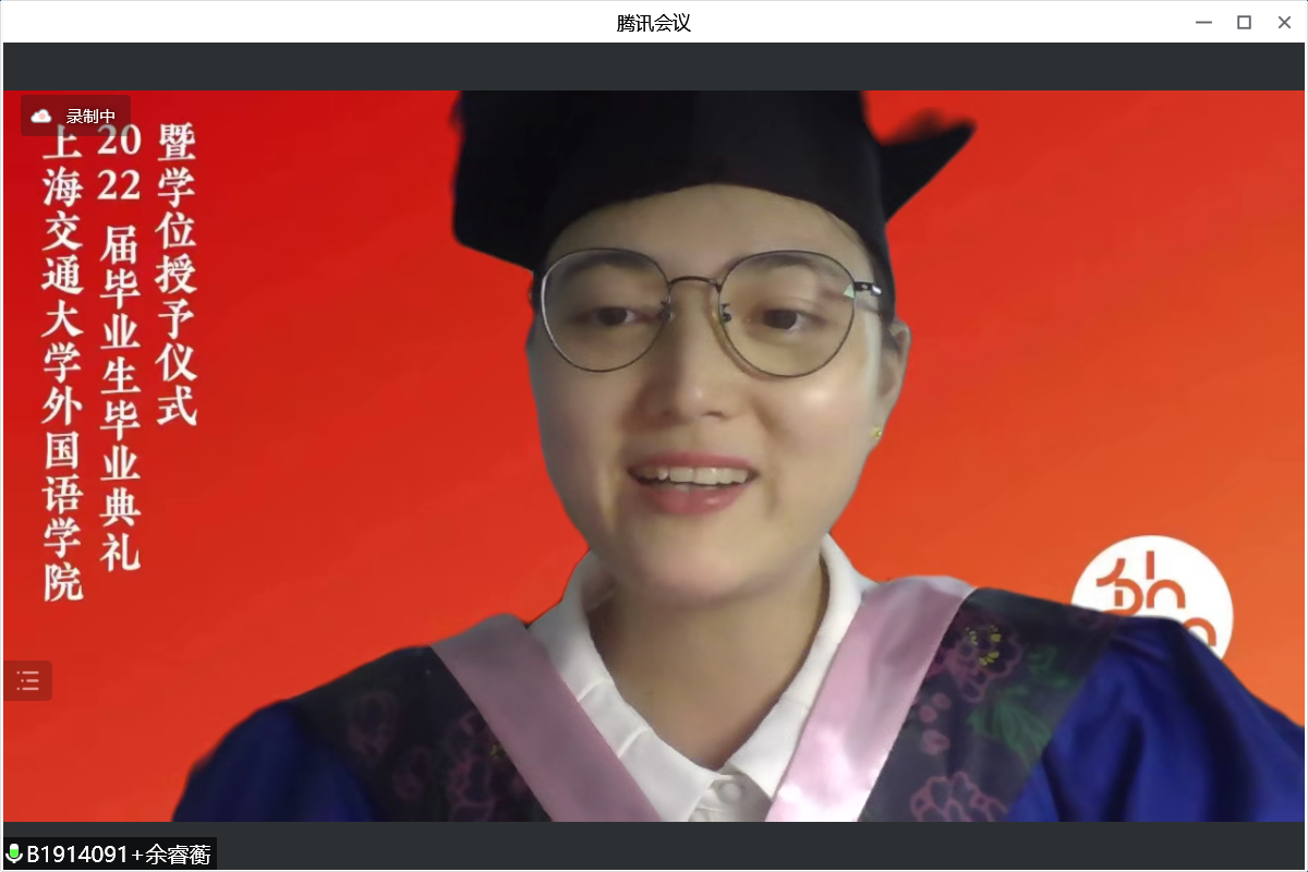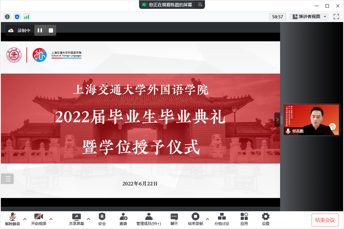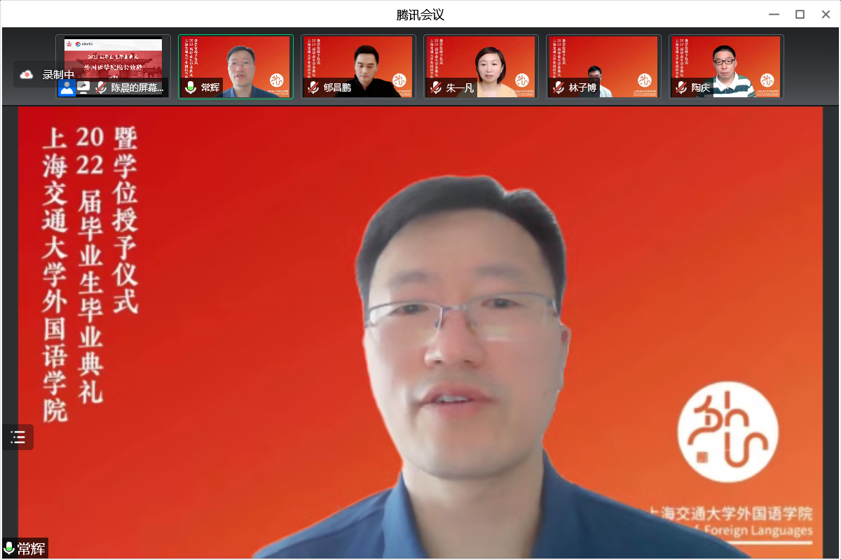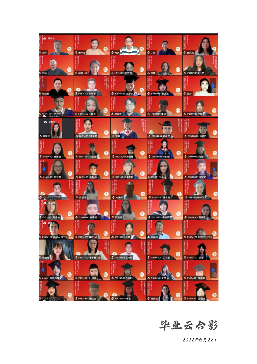 On the afternoon of June 22, the graduation ceremony and degree awarding ceremony for the 2022 graduates of the School of Foreign Languages was held online. Ding Jian, Secretary of the Party Committee of SFL, and Chang Hui, Dean of SFL, Zhang Hongmei, Vice Dean of SFL, and Tao Qing, Vice Dean of SFL, Xing Lianqing, Vice Secretary of the Party Committee of SFL, and Zhu Yifan, Vice Secretary of the Party Committee of SFL, as well as department heads and teacher representatives attended the ceremony. The invited alumni, Chen Haibo, the 2006 graduate from the English Department and CFO of MaxMara Fashion Group, attended the event. Class 2022 undergraduate, master's and doctoral graduates gathered in "Cloud" to celebrate this unforgettable moment together. The graduation ceremony was presided over by Assistant Dean Huan Changpeng.