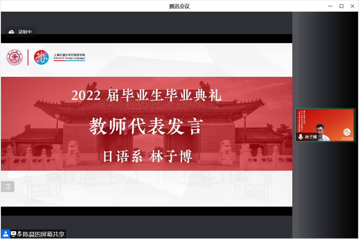 Lin Zibo, a teacher representative from the Japanese Department, recalled his regret of missing his doctor's graduation ceremony when he was a student and told the students to learn to accept it calmly and stick to their responsibilities and undertakings amid the dramatic change in the epidemic. He hoped that the graduates will always think about the days and nights of diligent work in SFL, the unremitting struggle for a happy life in their youth, so that this passion and drive can replace the confusion of relentless competition and find their own sea of stars.