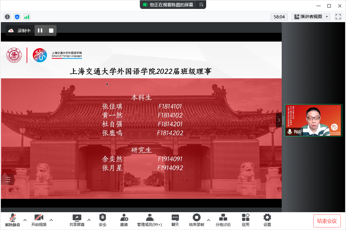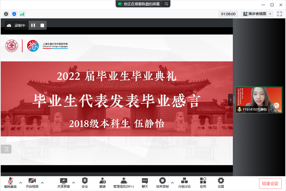 Ding Jian read out the list of "2022 Outstanding Graduates of Universities in Shanghai" and "2022 Outstanding Graduates of Shanghai Jiao Tong University" from the School of Foreign Languages, encouraging them to forge ahead and strive for the first on the road of life in the future .