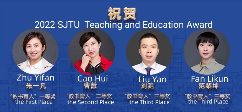 SJTU recently announced its 2022 Teaching and Education Award, honoring outstanding teachers. 4 teachers from the School of Foreign Languages won 2022 SJTU Teaching and Education Award, with Zhi Yufan winning the first place, Cao Hui winning the second place, Liu Yan and Fan Likun winning the third place, breaking the SFL history record and ranking among the best in SJTU.