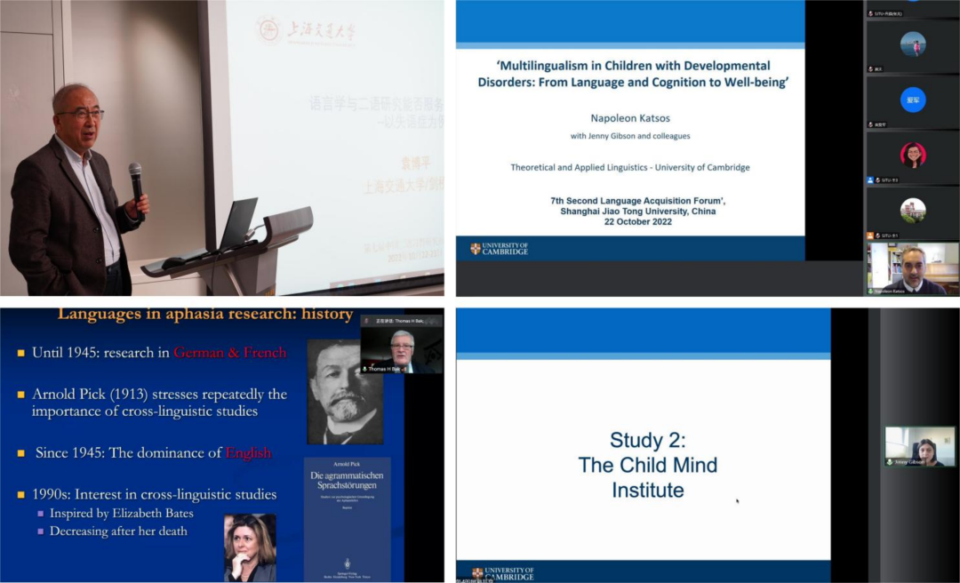 With the theme of "Second Language Acquisition and Human Health", Professor Boping Yuan of SJTU discussed the potential contribution of linguistics and second language acquisition to human health and their positive roles in the "Healthy China" strategy. Professor Napoleon Katesus from the University of Cambridge discussed the positive effects of a second language (multilingual) environment on the cognition of children with autism. Professor Thomas Baker of the University of Edinburgh highlighted the importance of bilingualism for research into brain disorders like aphasia and dementia, exploring the positive effects of learning a foreign language on the brain across the life span. Professor Jenny Gibson of the University of Cambridge reported their results of experiments on children with neurodevelopmental disabilities who proved to have performed well in a bilingual or multilingual environment.